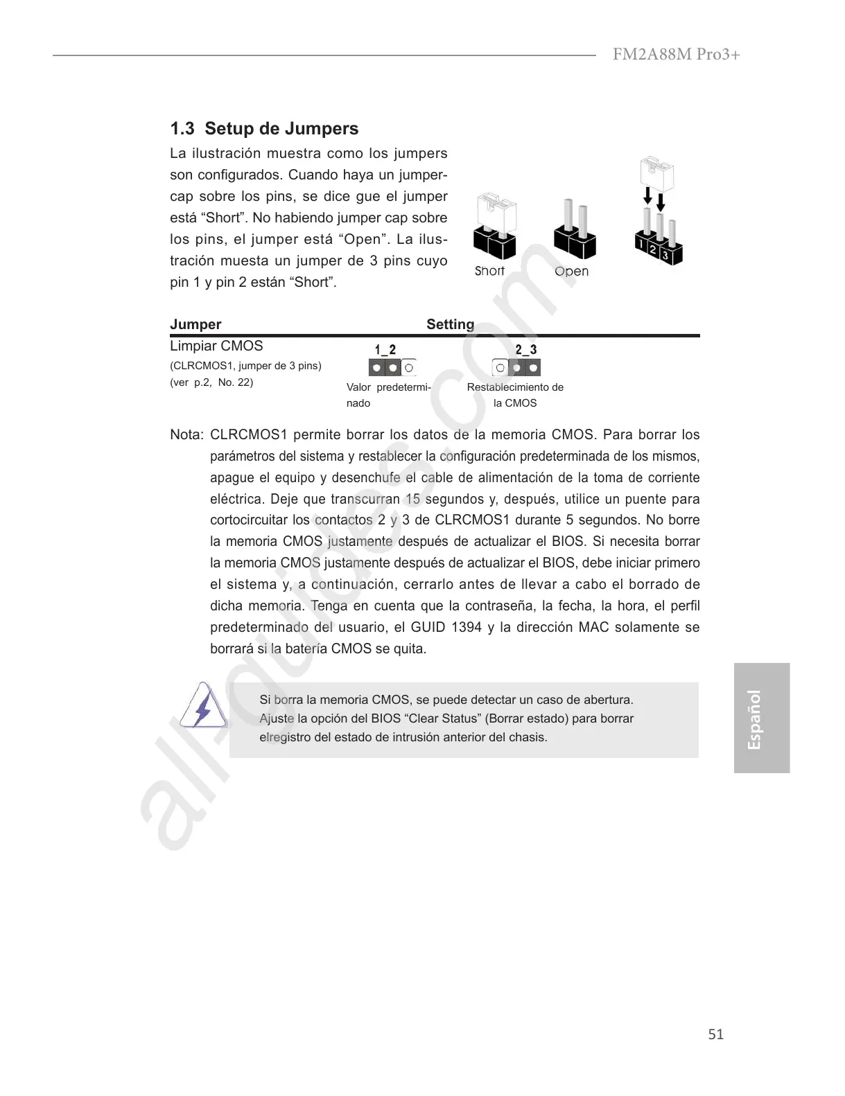 cortocircuitar los contactos 2 y 3 de CLRCMOS1 durante 5 segundos. No borre
