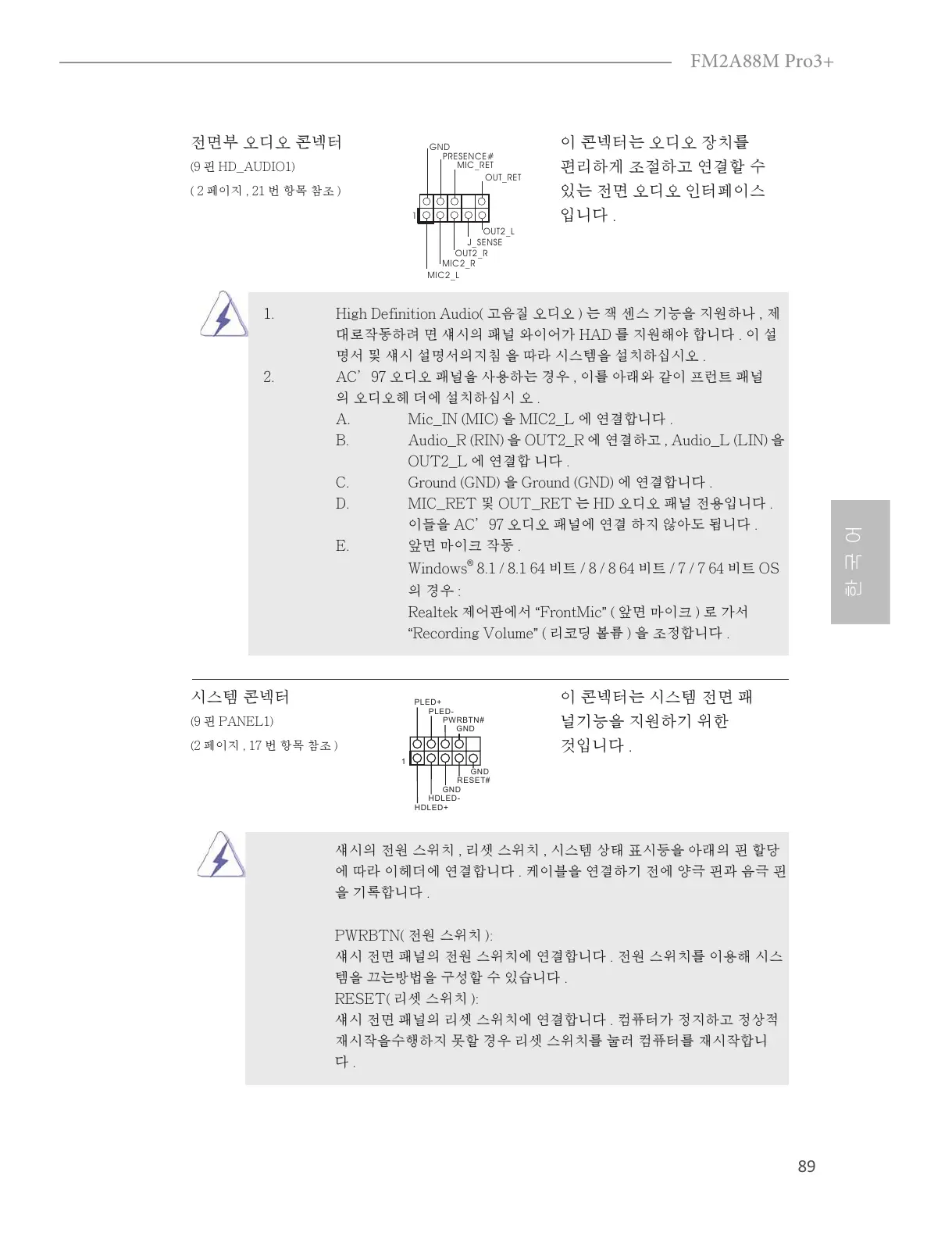 2. AC’97 오디오 패널을 사용하는 경우 , 이를 아래와 같이 프런트 패널