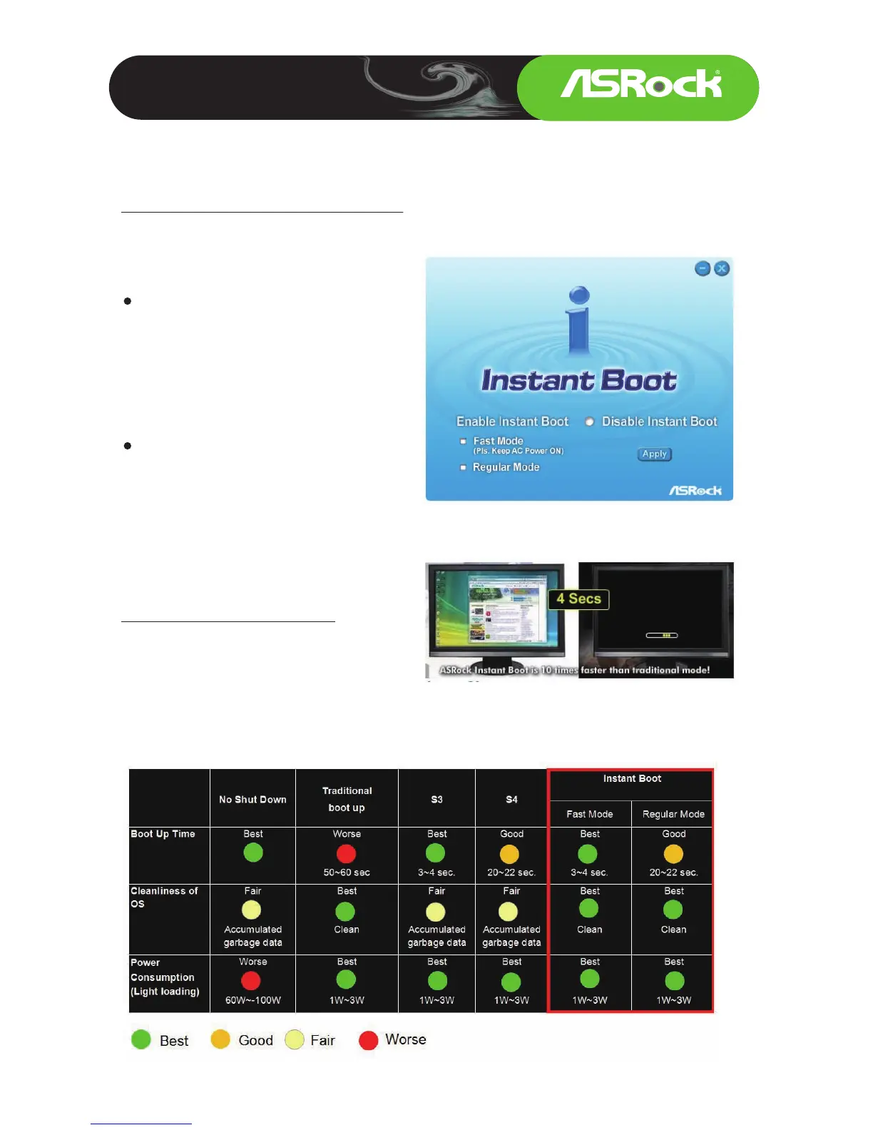 From this sum up table, we can find that ASRock Instant Boot not only excels in the Boot Up speed (3~4 sec.), it