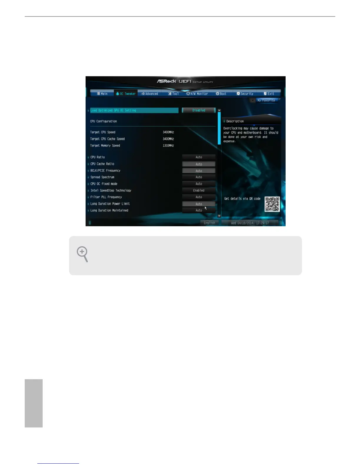 In the OC Tweaker screen, you can set up overclocking features.