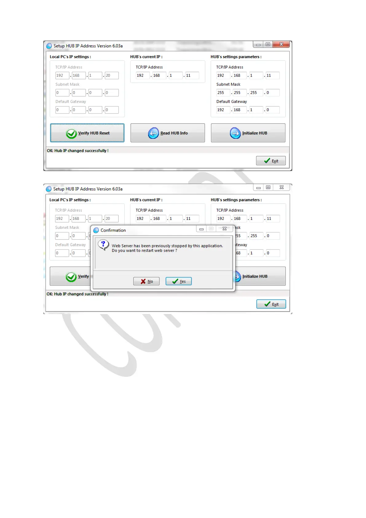 The hub is now being initialized with the new IP address (in the example 192.168.1.11).