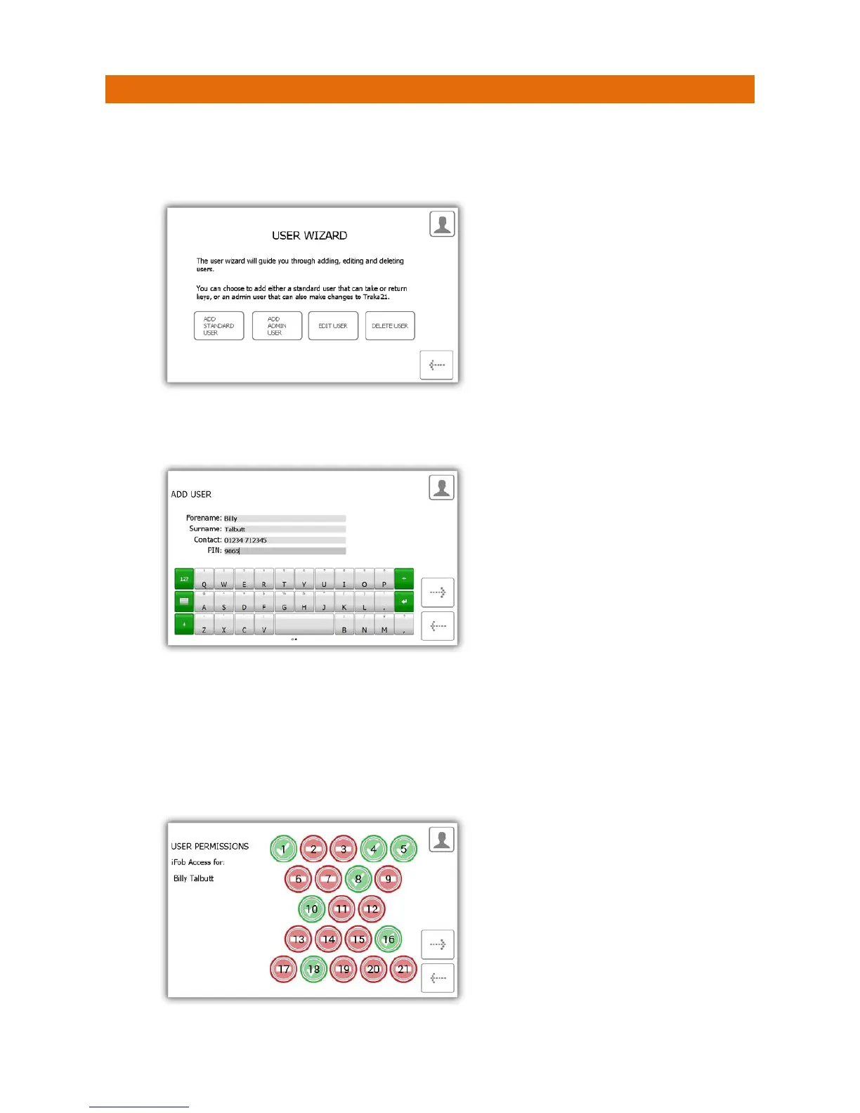 3. Next you will need to select the user’s permissions. Using the touch screen simply select which iFobs the user