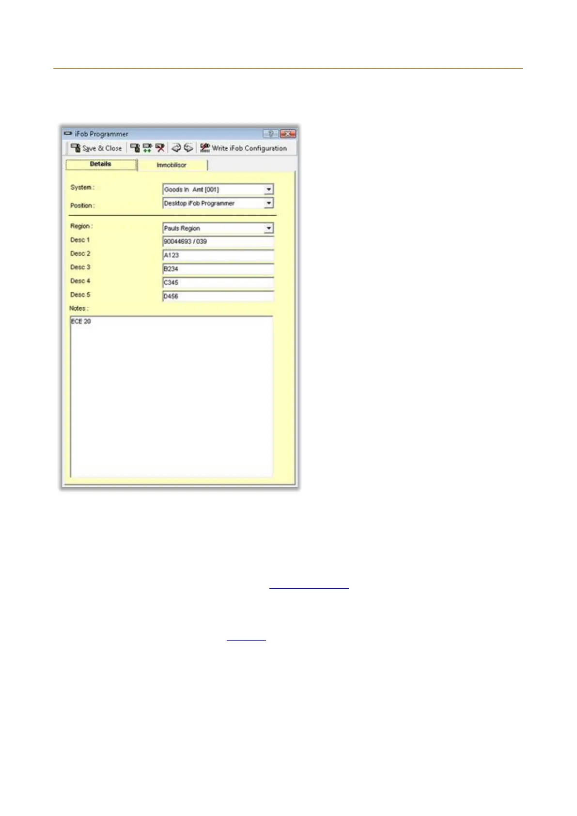 Here there are five definable detail fields for the Immobilisor. To change these field headings please refer to