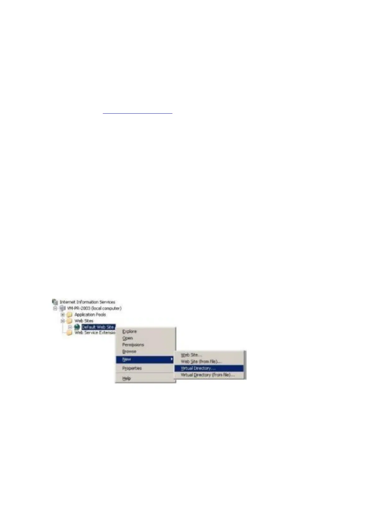 IIS, select the Default Web Site node, then right click and select New>Virtual Directory (see below).