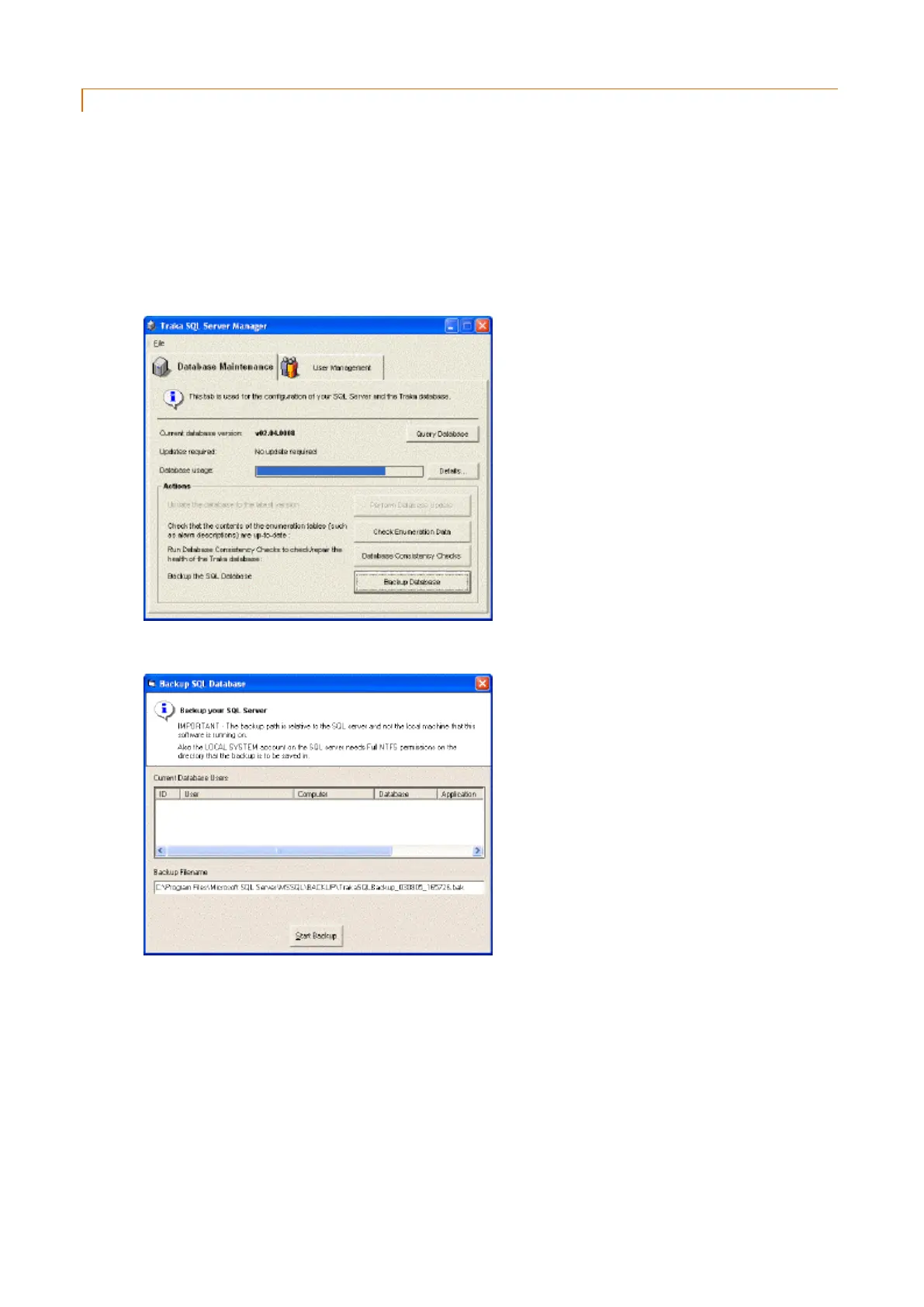 The Traka SQL Server Manager can be used to make a backup of the selected Traka database...