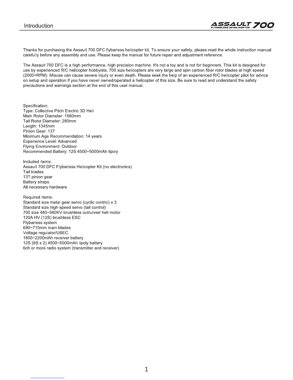 Assault 700 DFC - Introduction; Specifications; Included and Required Items