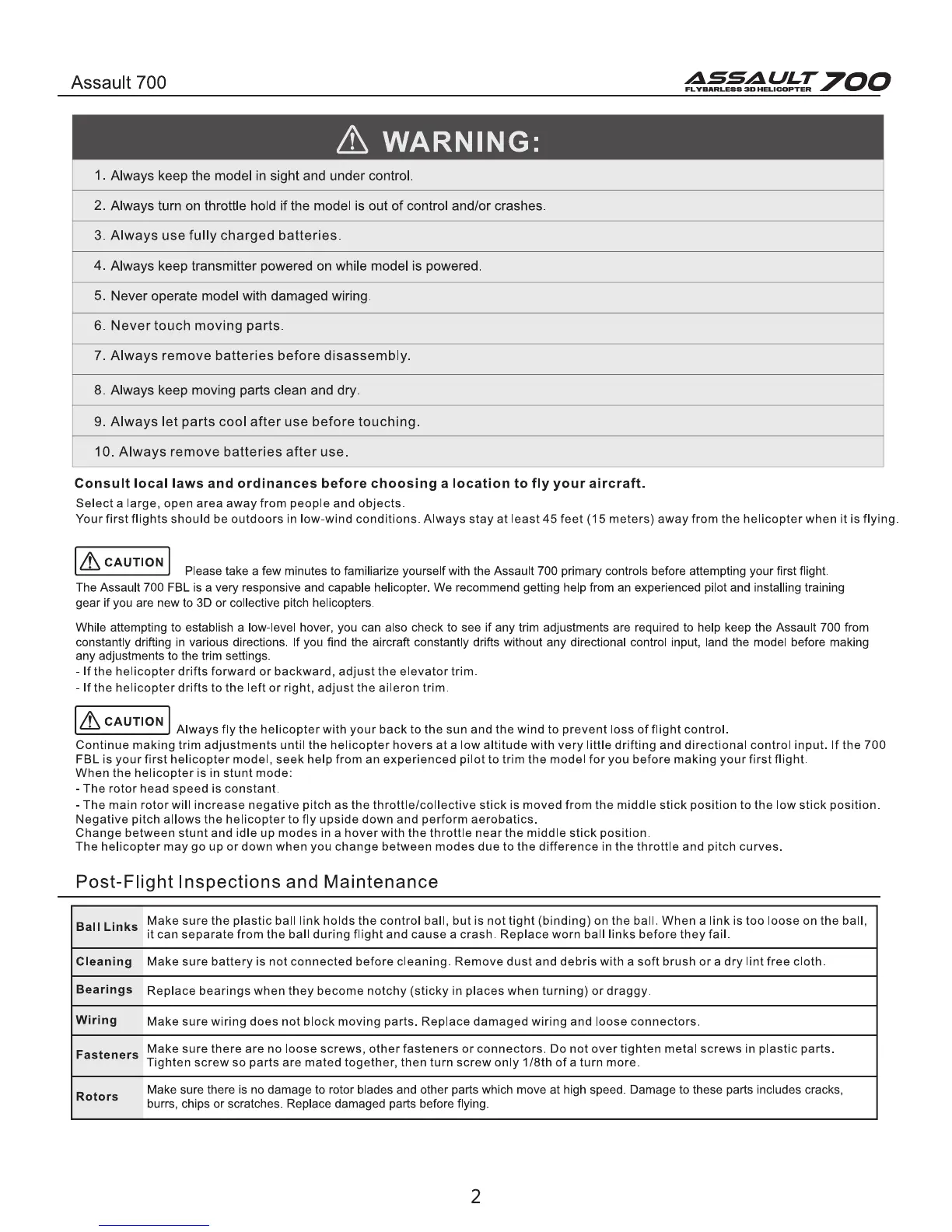 Assault 700 DFC - Operation and Maintenance Guidance; Flying Location and Precautions; Post-Flight Inspections and Maintenance