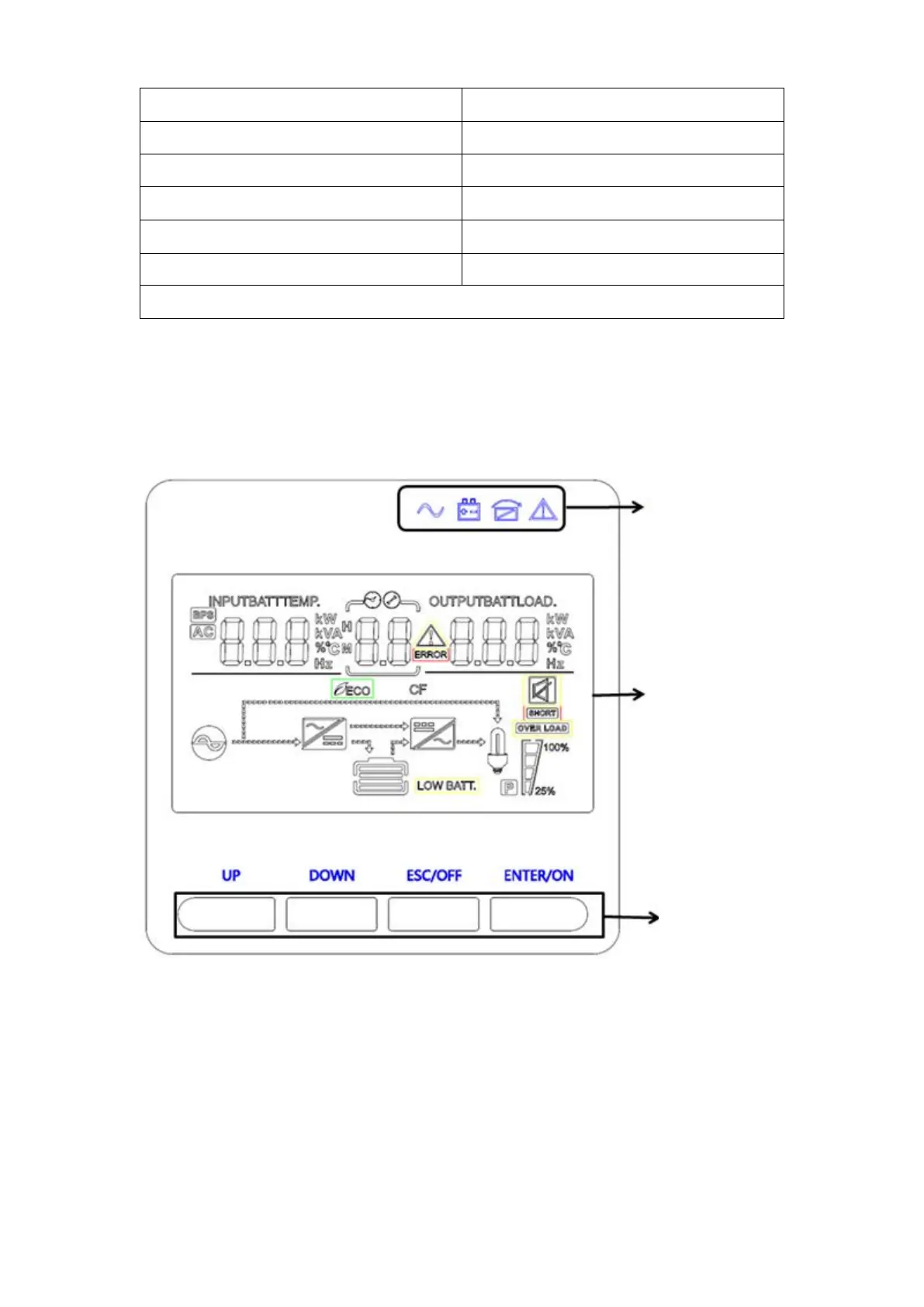 ① LED (from right to left: “alarm”, “bypass”, “battery”, “inverter”)