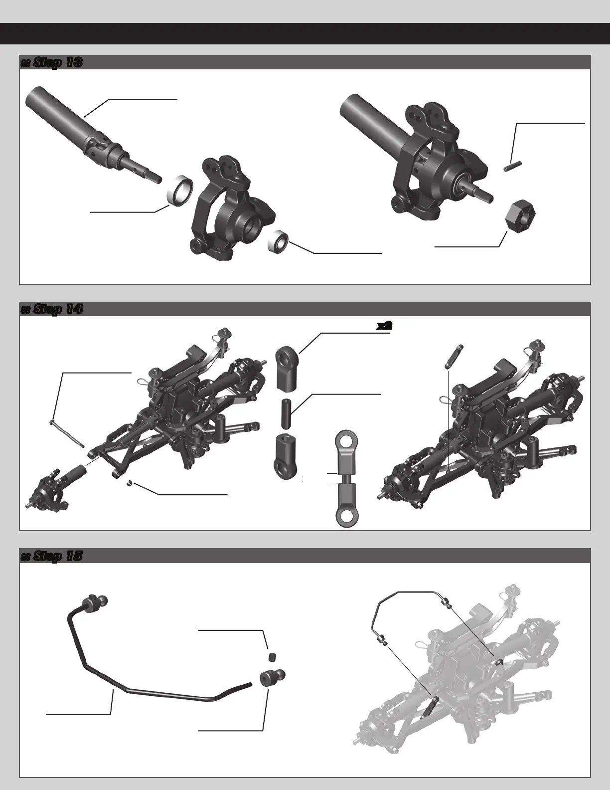 Associated Electrics PRO4 SC10 - Front Hub and Suspension Assembly; Step 13: Front Hub Assembly; Step 14: Front Suspension and Anti-Roll Bar; Step 15: Front Anti-Roll Bar Installation