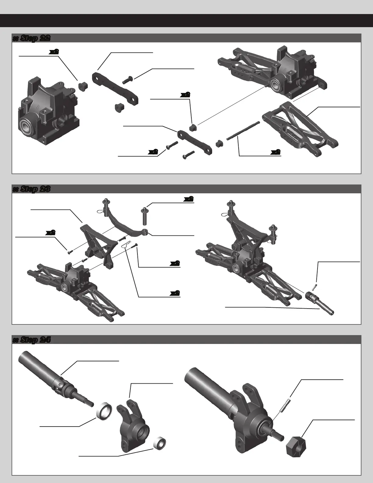Associated Electrics PRO4 SC10 - Rear Suspension and Hub Assembly; Step 22: Rear Arm Mount Assembly; Step 23: Rear Shock Tower and Body Mount; Step 24: Rear Hub Assembly