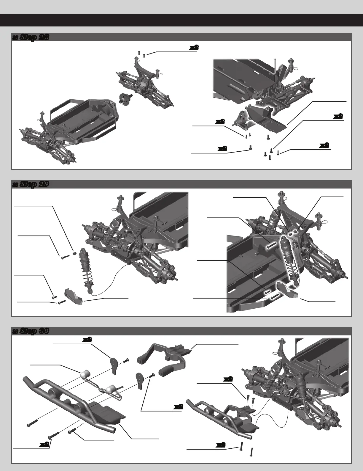 Associated Electrics PRO4 SC10 - Front Chassis Components; Step 28: Skid Plate and Front Assembly; Step 29: Front Suspension and Shock Guards; Step 30: Front Bumper Assembly