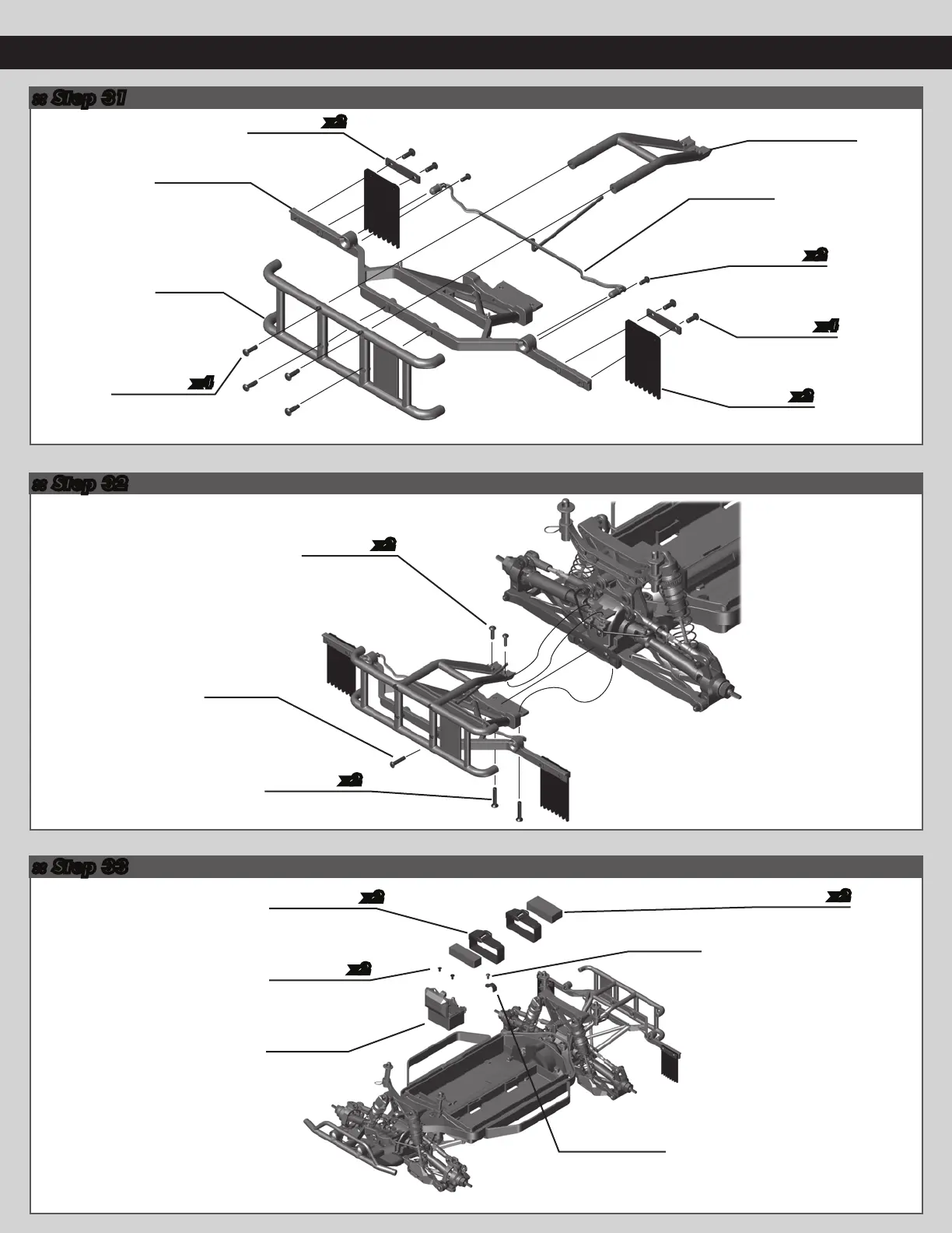 Associated Electrics PRO4 SC10 - Rear Chassis Components; Step 31: Rear Bumper and Mud Flaps; Step 32: Rear Bumper and Hook;Loop Straps; Step 33: Battery Tray and Receiver Box
