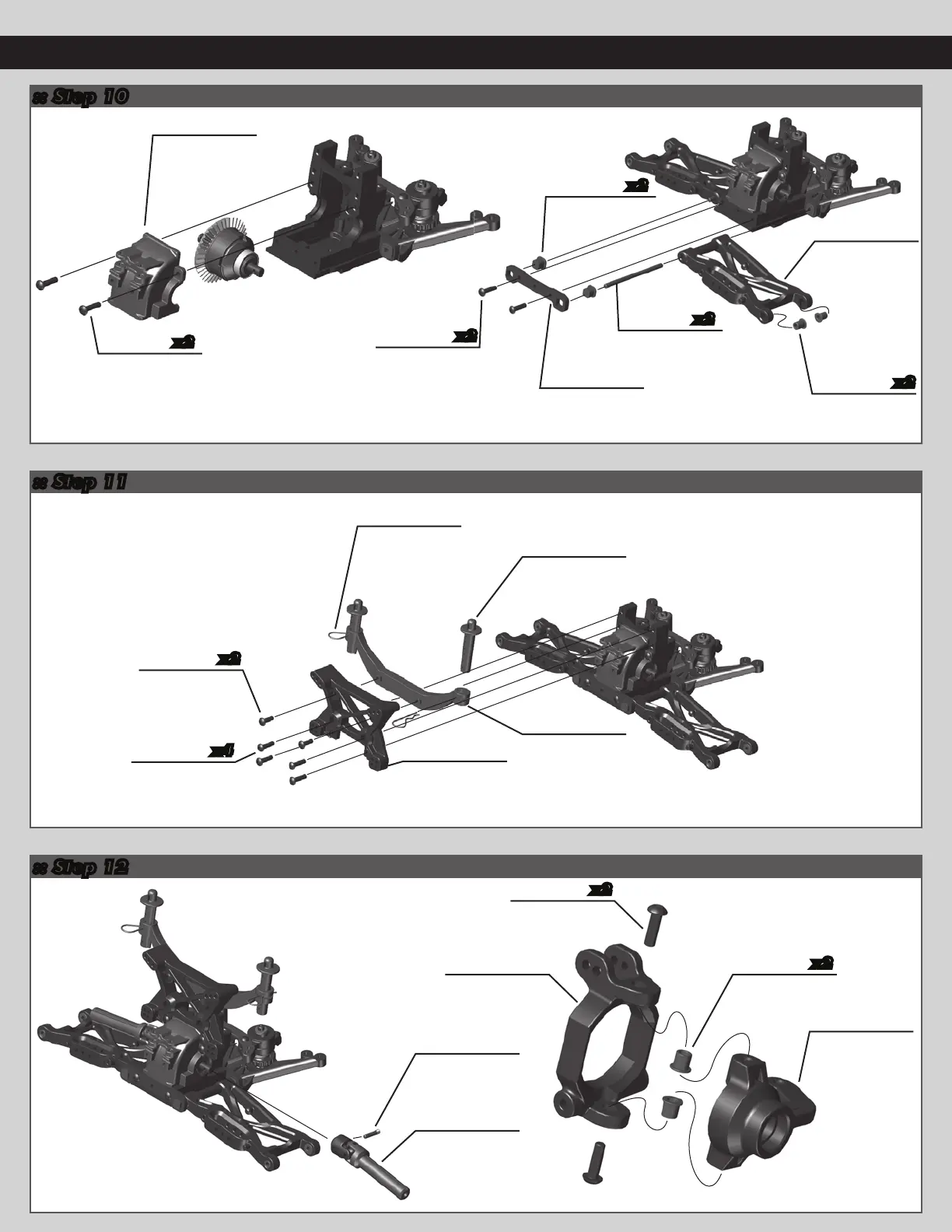 Associated Electrics PRO4 SC10 - Chassis and Body Mount Assembly; Step 10: Front Arm and Gearbox Mount; Step 11: Body Mount Assembly; Step 12: Steering Block and Caster Block