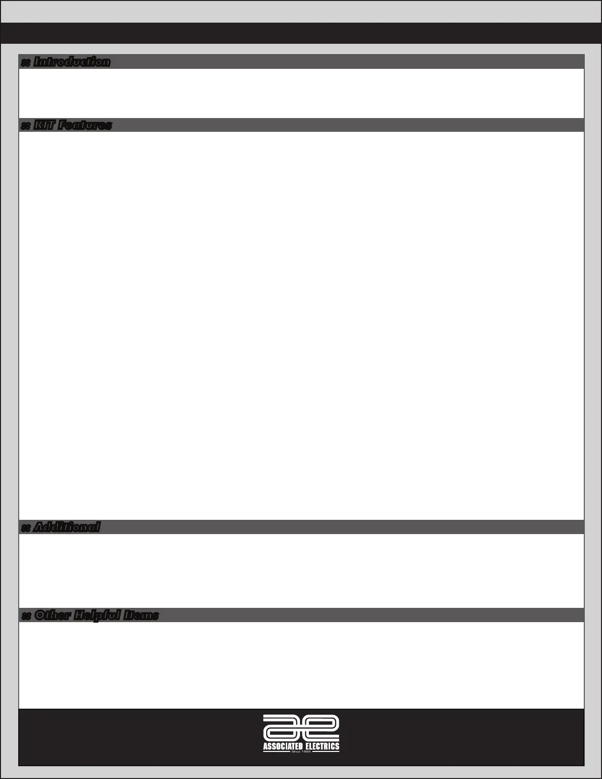 Thank you for purchasing this Team Associated product. This assembly manual contains instructions and tips for building and