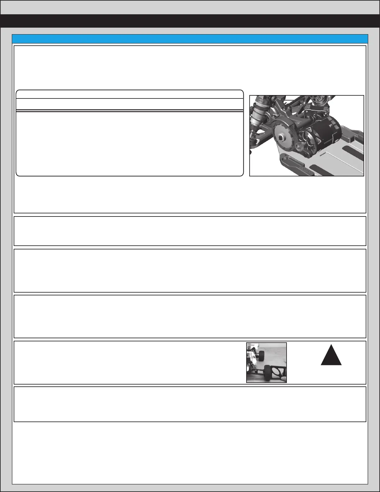 Another popular way to set the clutch is to hold both rear tires fi rmly in place and apply short bursts of throttle. If the clutch is properly set,