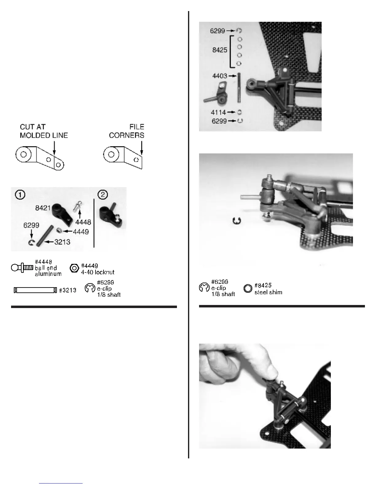 #1. First install one #6299 E-clip onto each #4403 kingpin. Next