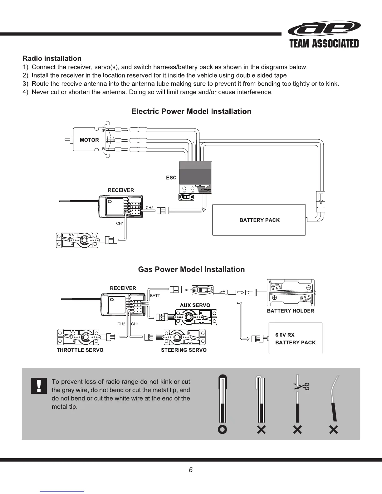 Associated Electrics XP2G - Radio Installation; Electric Power Model Installation; Gas Power Model Installation