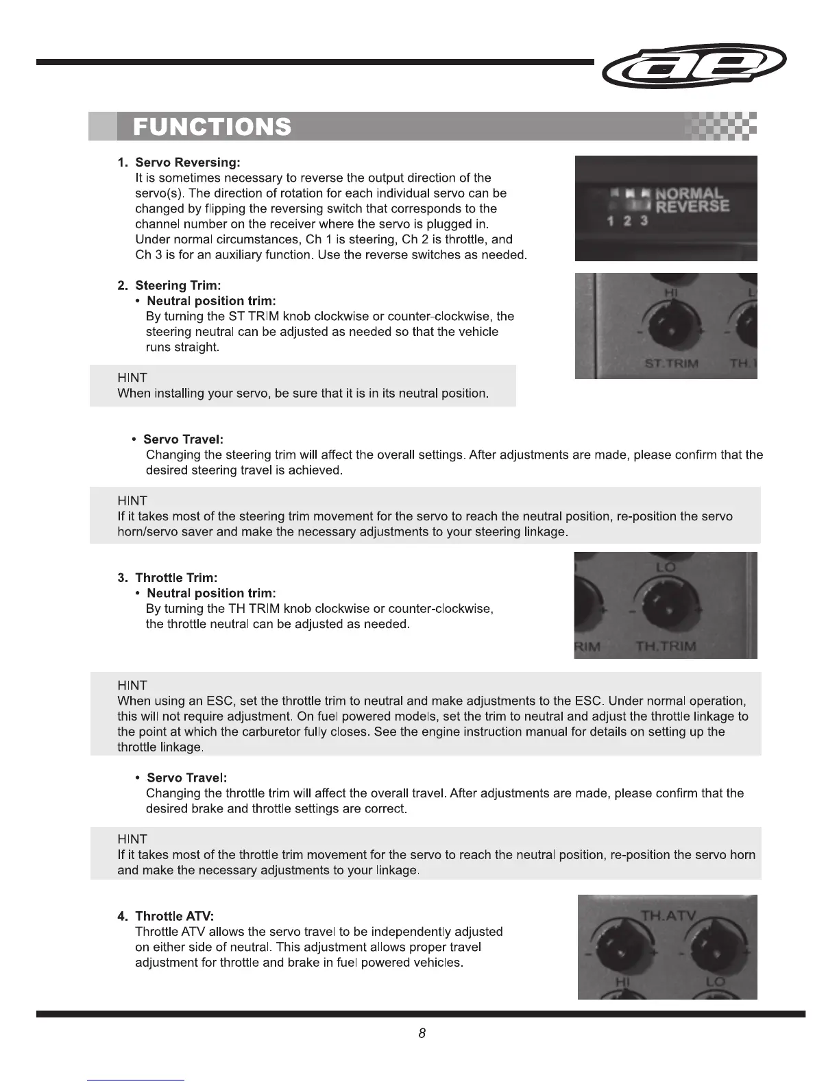 Associated Electrics XP3-SS - Functions; Servo Reversing; Steering Trim; Throttle Trim, Throttle ATV