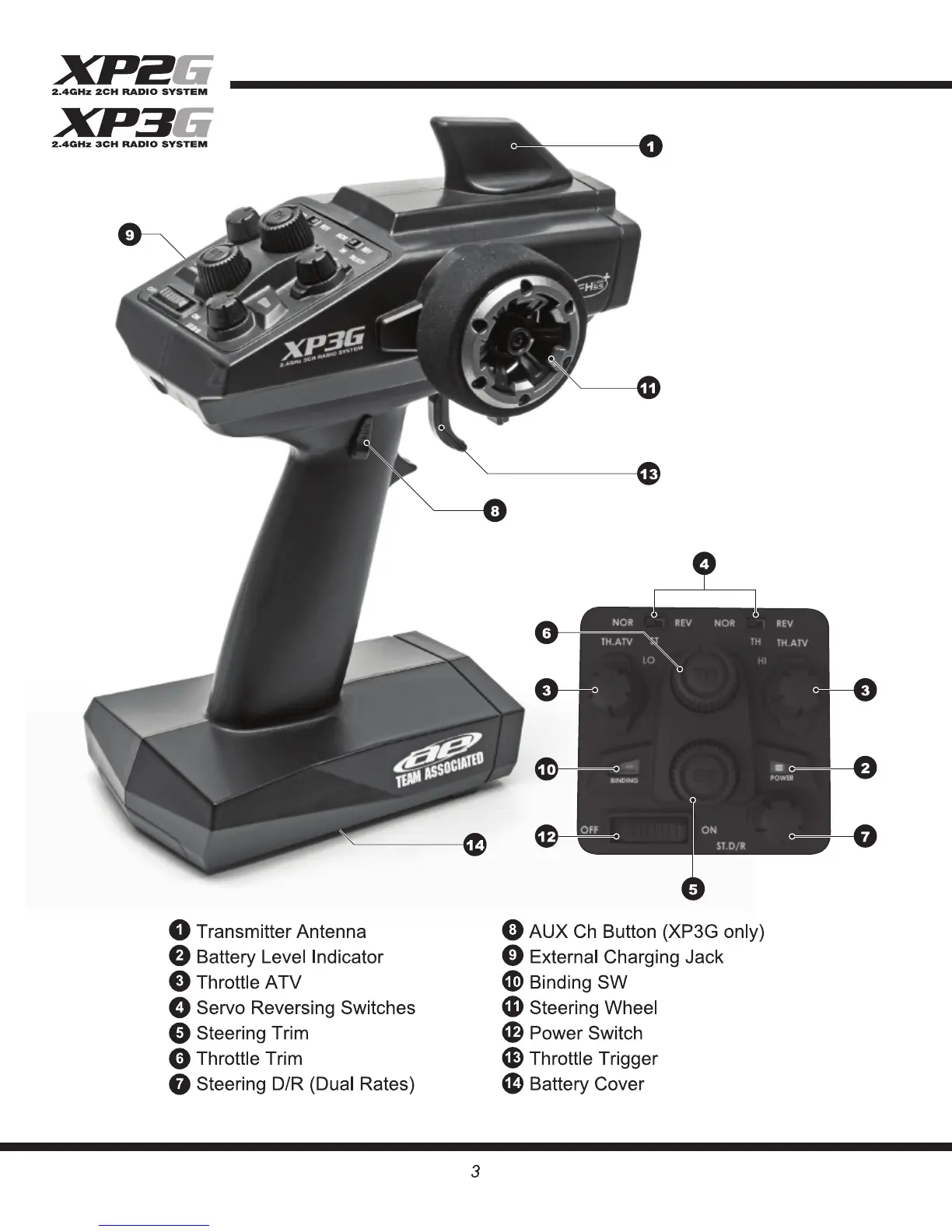 Associated Electrics XP3G - TRANSMITTER CONTROLS OVERVIEW; Transmitter Antenna; Battery Level Indicator; Throttle ATV