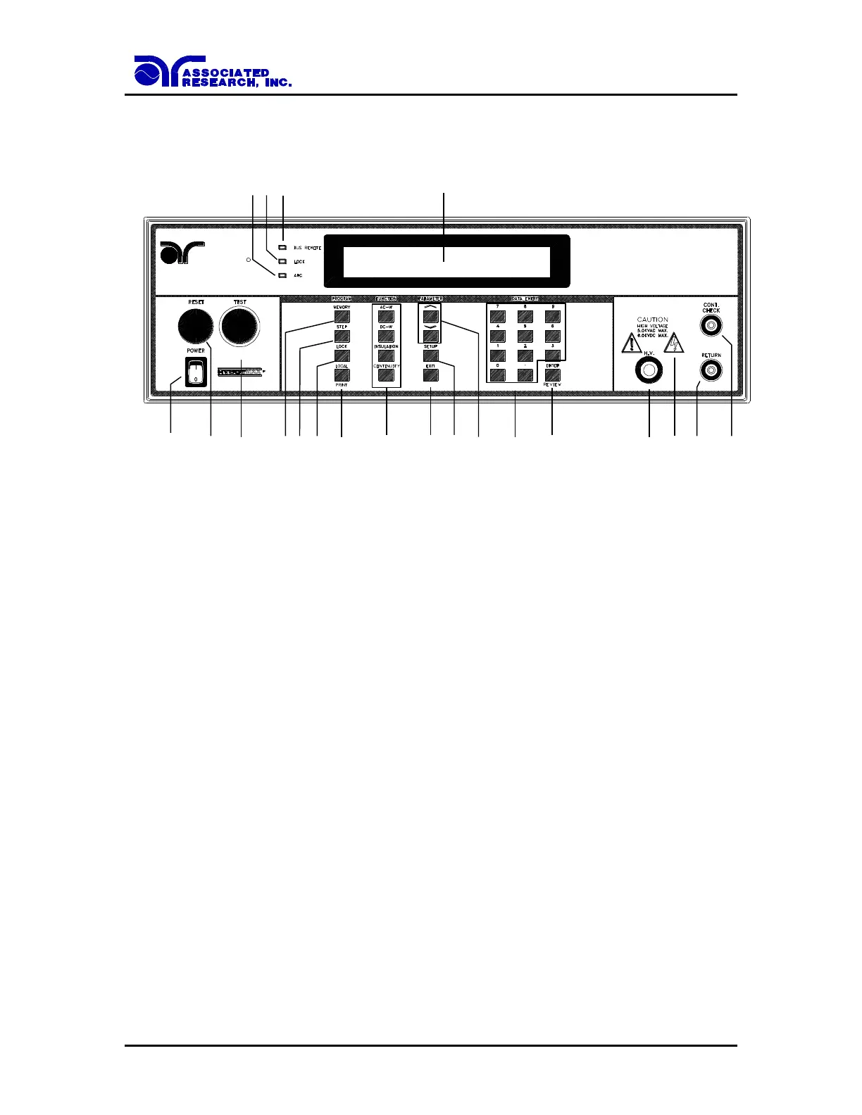 4. LCD DISPLAY: The 2x20 character display indicates test function, memory and