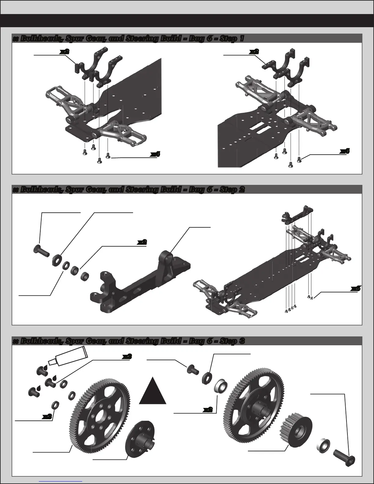 Associated TC7.2 - Bulkheads, Spur Gear, and Steering Build - Bag 6; Bulkheads, Spur Gear, and Steering Build - Bag 6 - Step 1; Bulkheads, Spur Gear, and Steering Build - Bag 6 - Step 2; Bulkheads, Spur Gear, and Steering Build - Bag 6 - Step 3