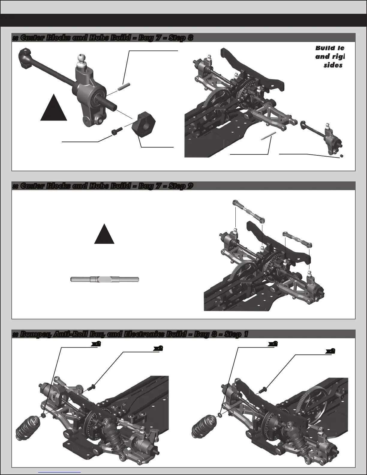 Associated TC7.2 - Caster Blocks and Hubs Build - Bag 7 - Step 8; Caster Blocks and Hubs Build - Bag 7 - Step 9; Bumper, Anti-Roll Bar, and Electronics Build - Bag 8; Bumper, Anti-Roll Bar, and Electronics Build - Bag 8 - Step 1