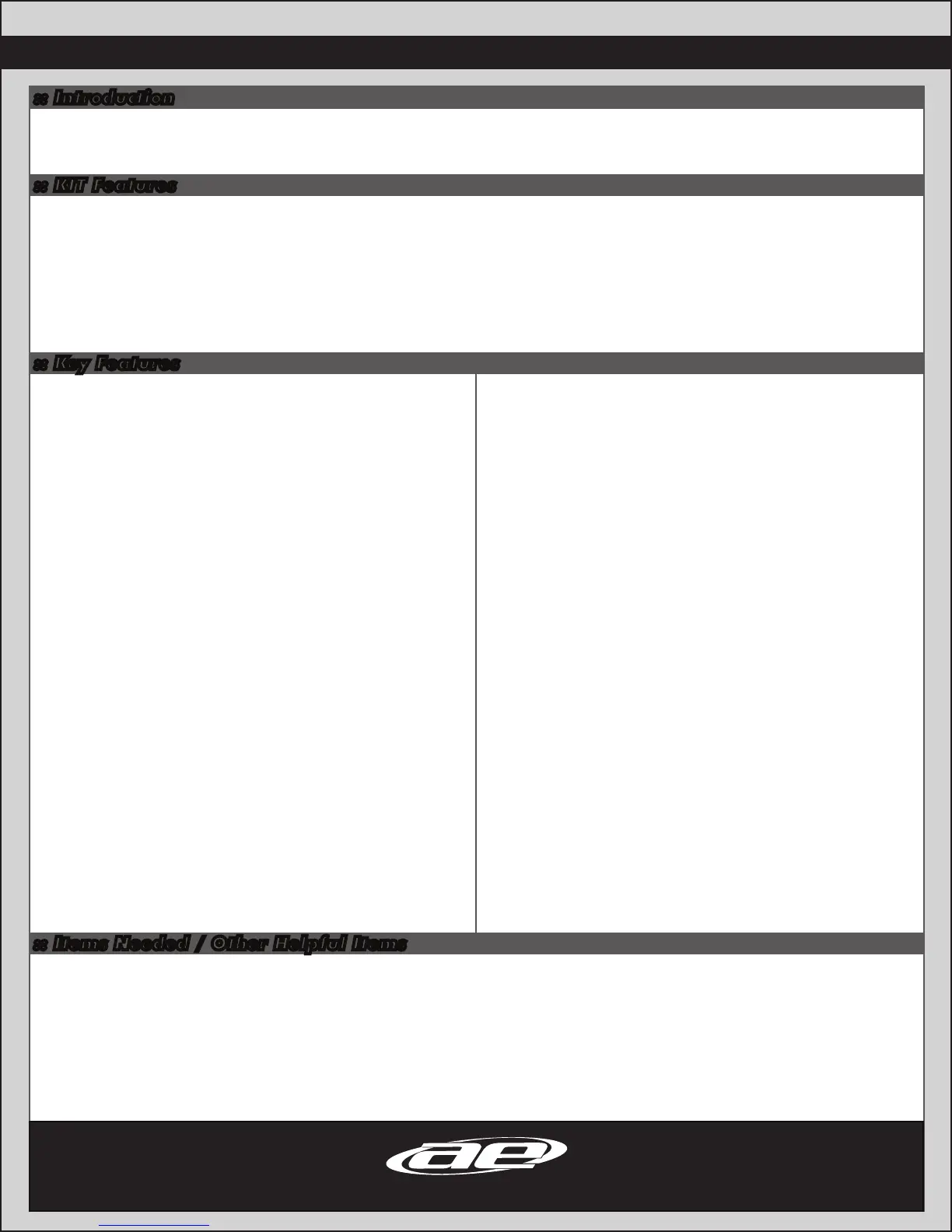 • Silicone Shock Fluid (Refer to catalog for complete listings) • CA Glue (AE Part# 1597)
