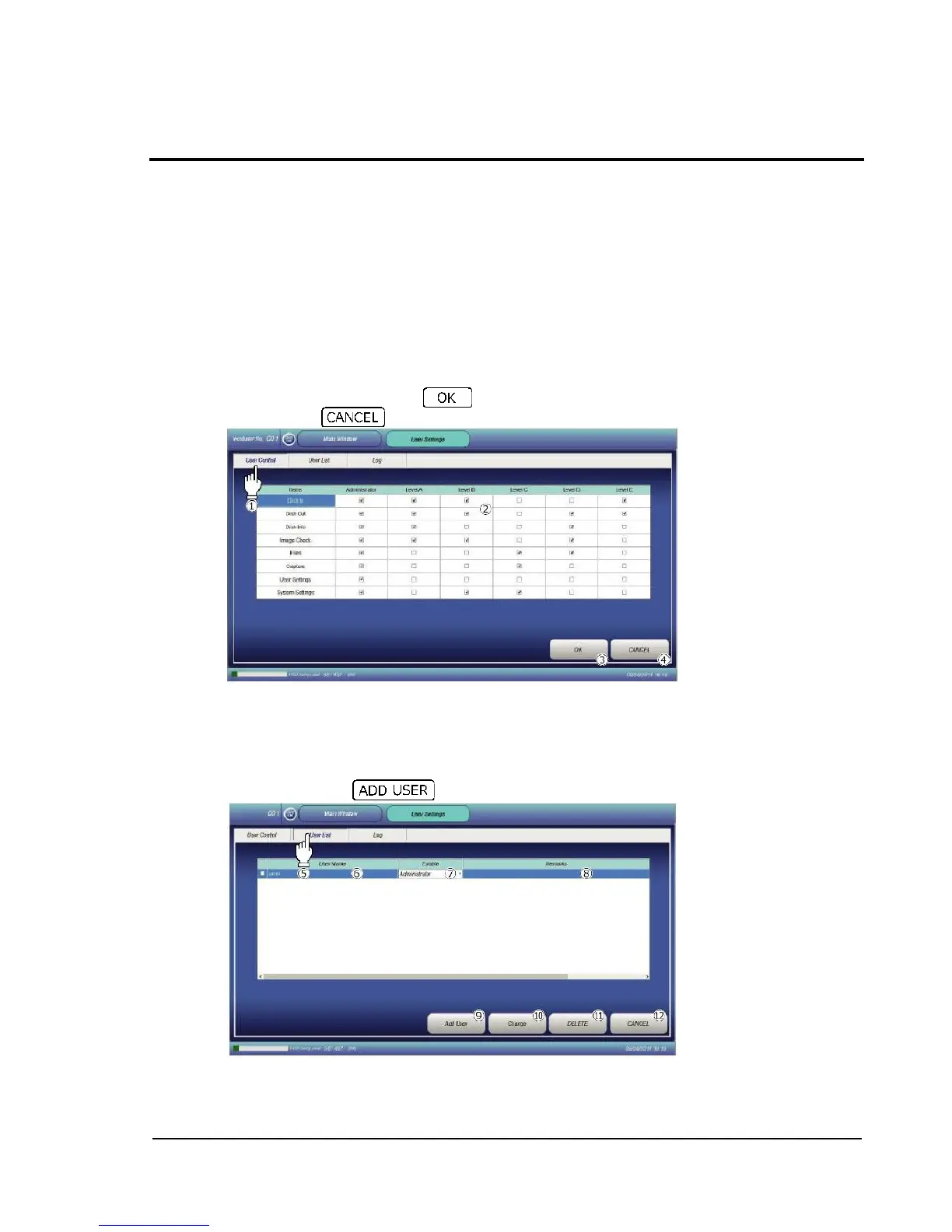 The following five user levels are selectable: administrator and Levels A to E. To make settings,