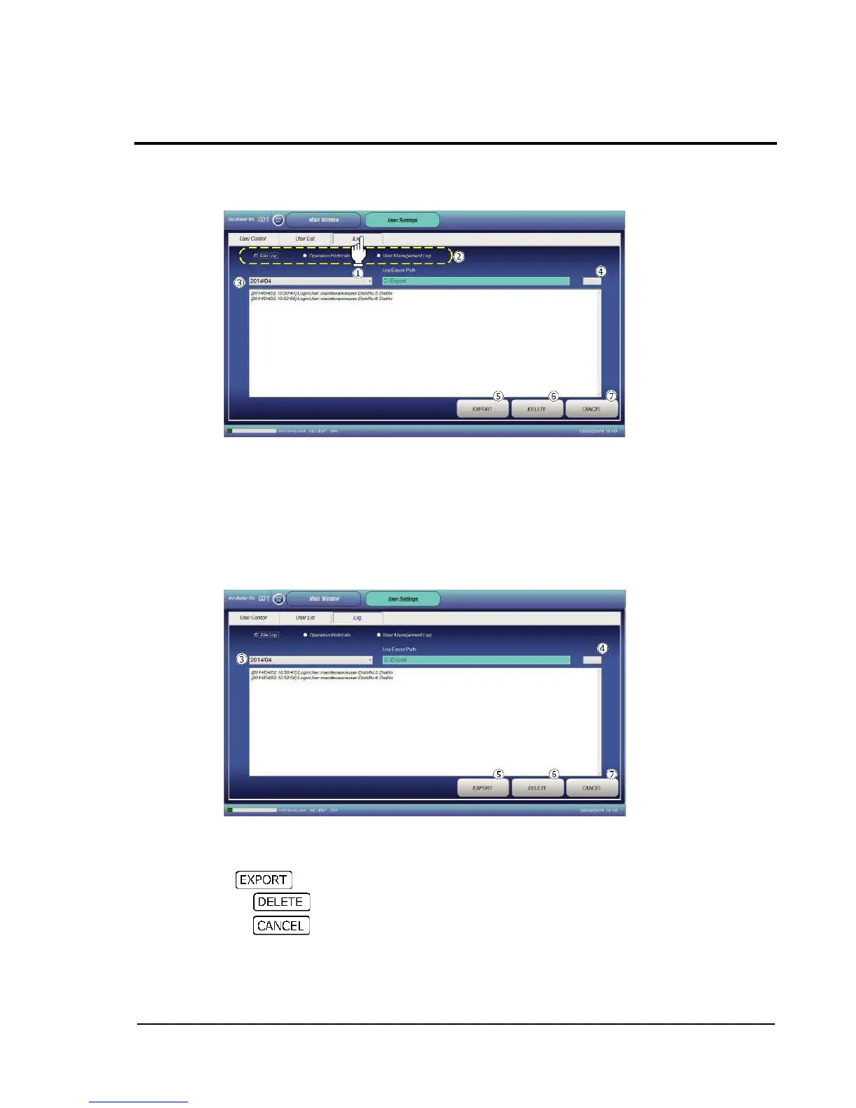 Touching the Log tab displays the log information screen. The screen allows display of the following