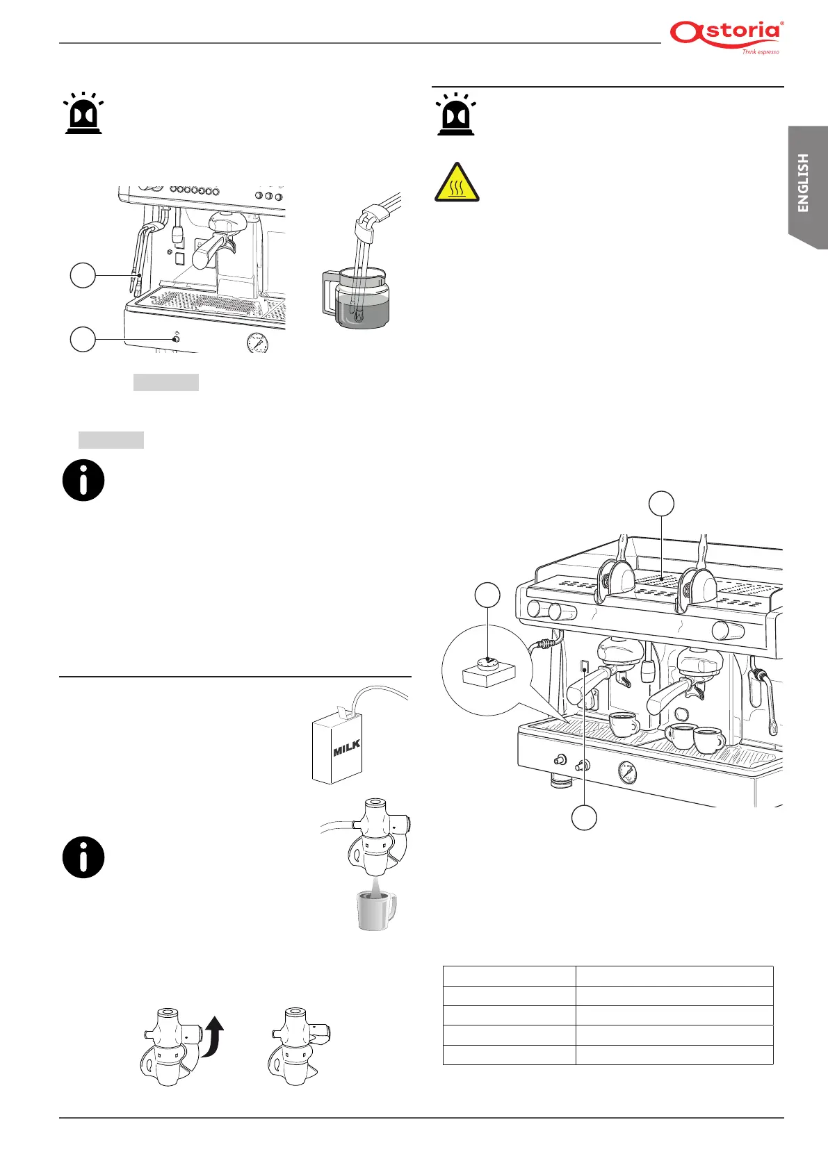 • Immerse the automatic steam wand nozzle tips (1) into