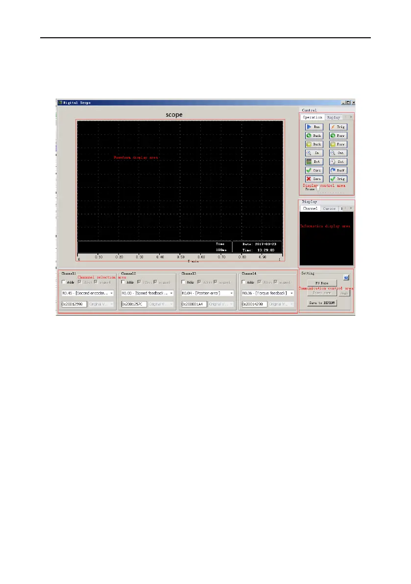 ⚫ Communication control area: enables you to start and stop oscilloscope communication, save