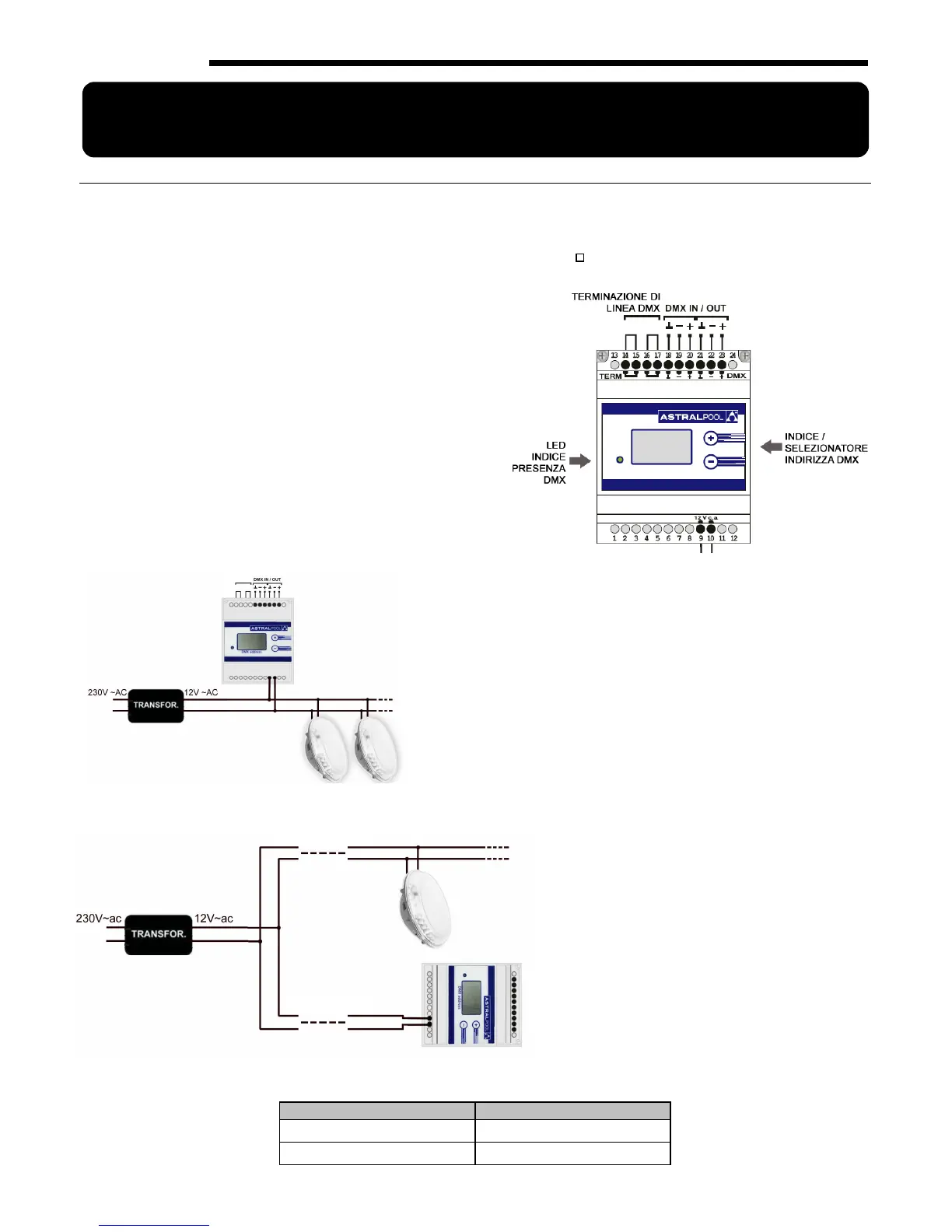 Il modulatore DMX si connette al secondario del trasformatore da 12 V~AC per mezzo dei morsetti 9 e 10.