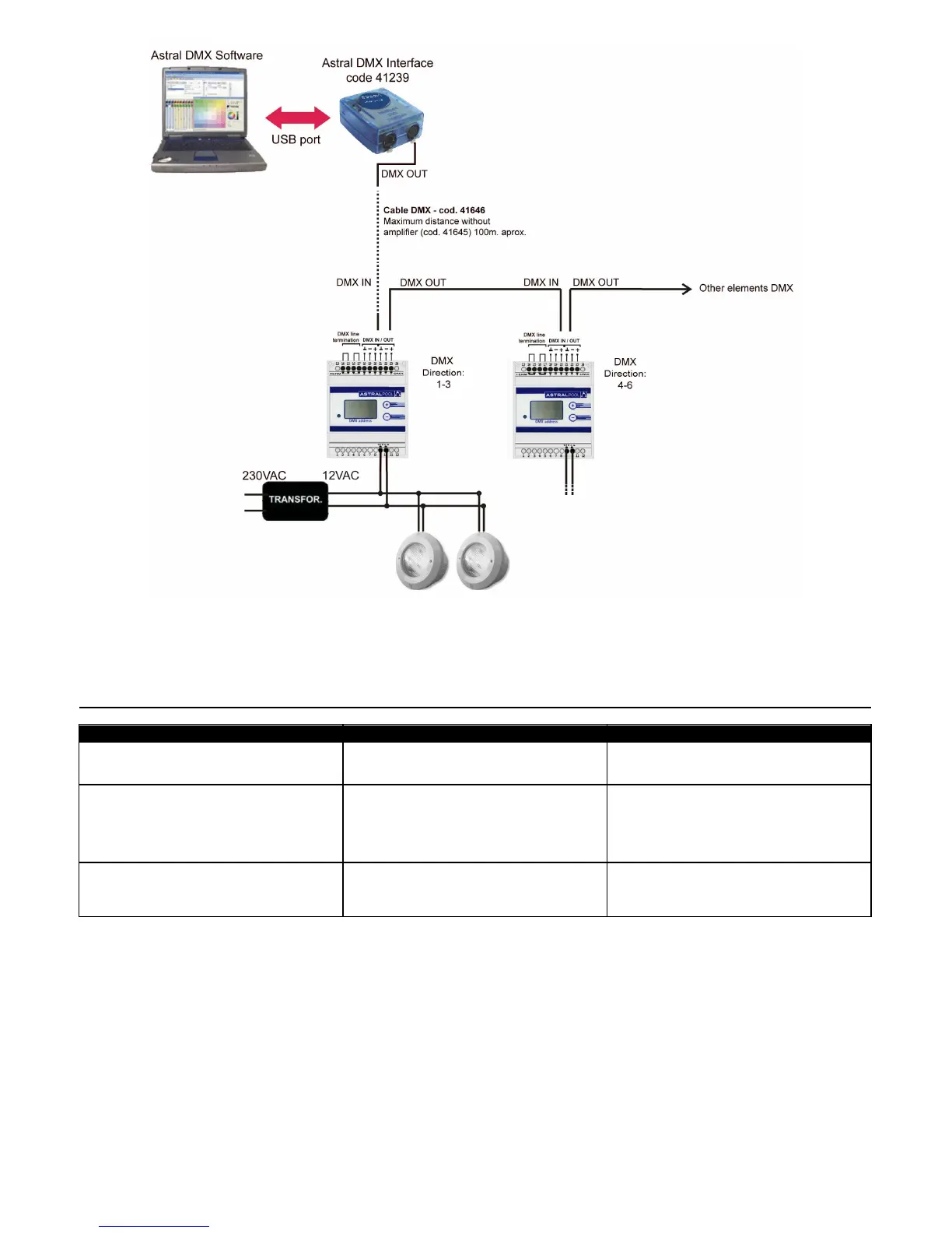 Through a DMX modulator (code 41107) you can control 3 channels, which correspond to red, green and blue of all the projectors connected to