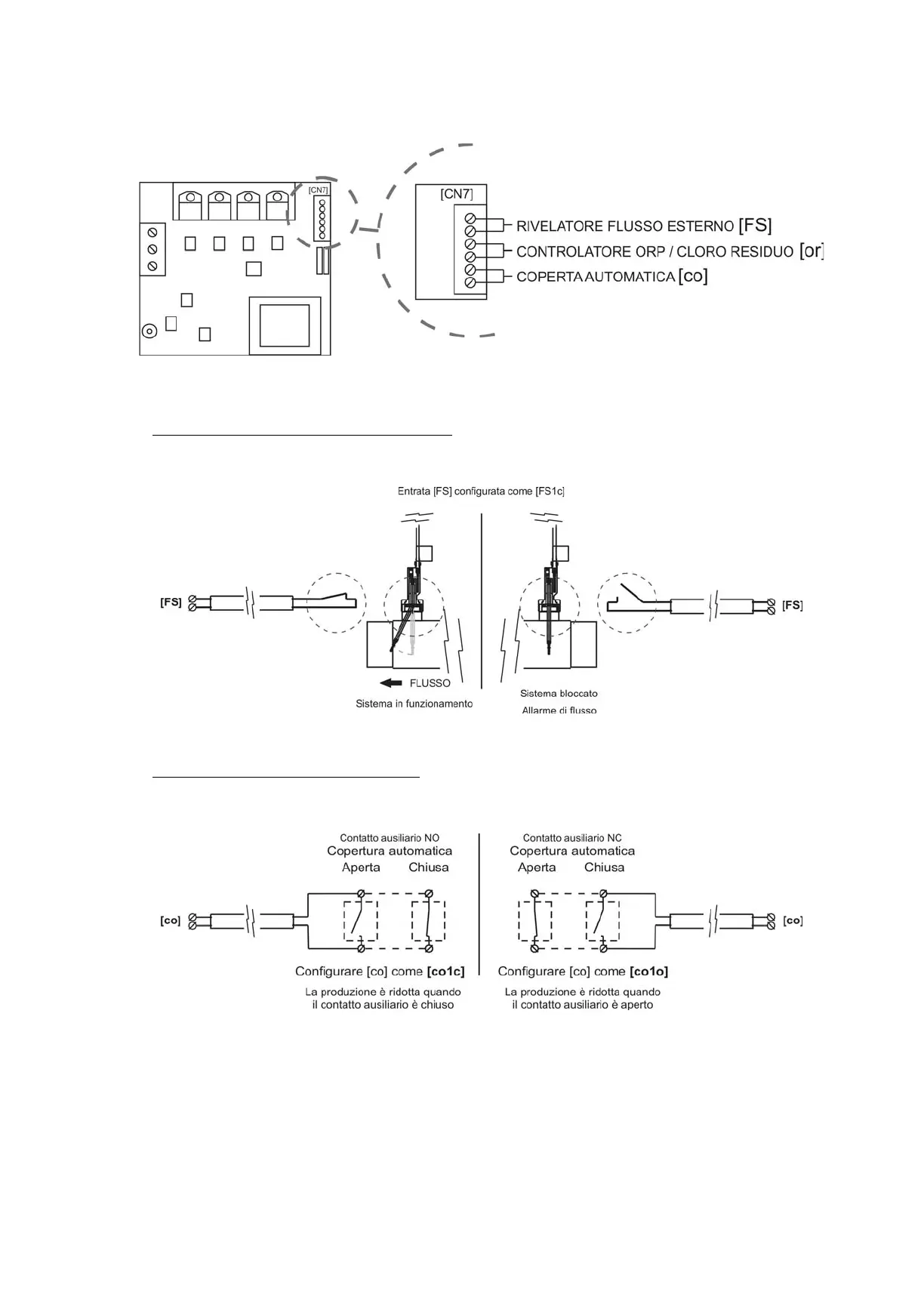 z [FS] CONTROLLO RIVELATORE FLUSSO ESTERNO: entrata per contatto libero di tensione. Quando il contatto collegato a questa