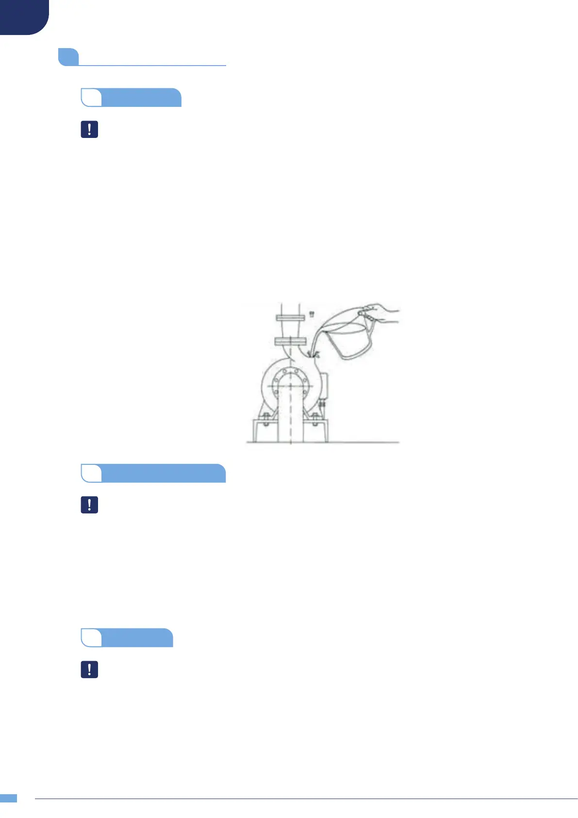 • Before starting up, the pump must be primed with water. The water cools and lubricates the