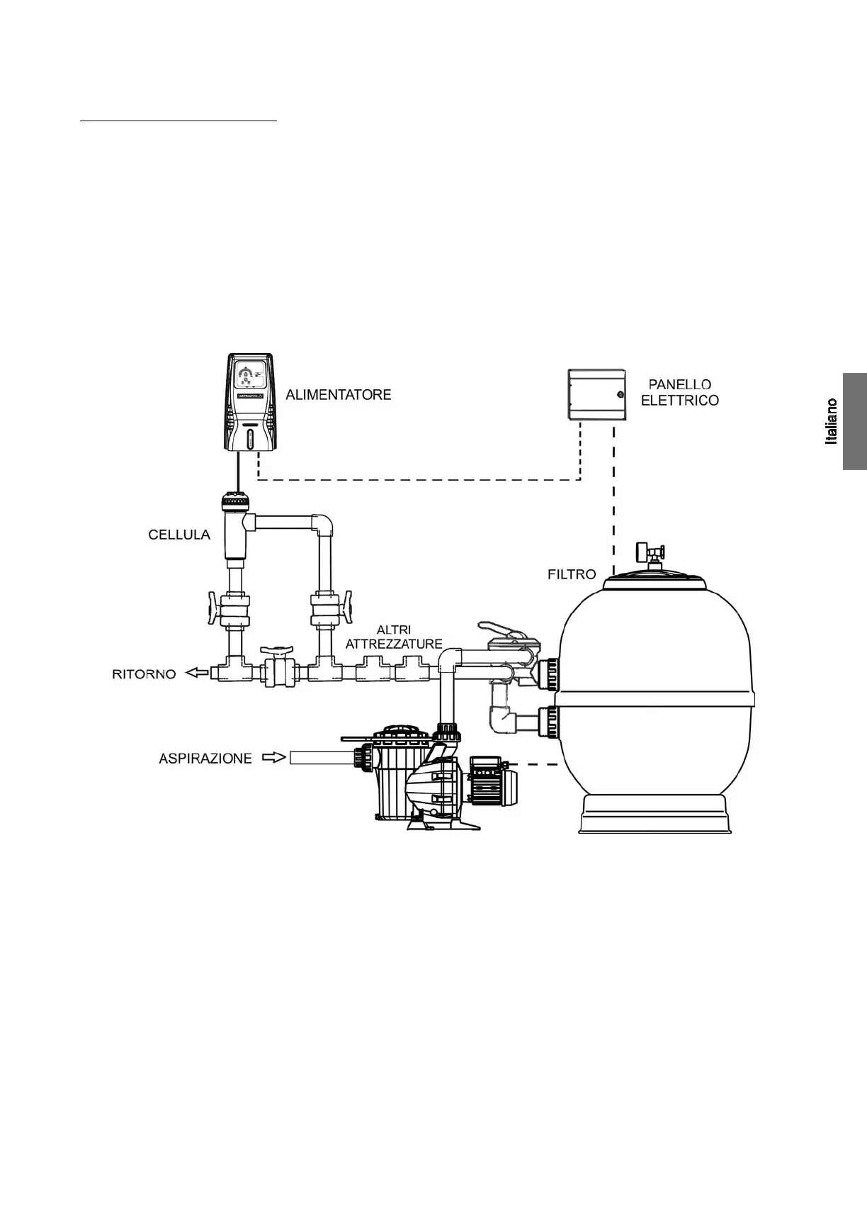asciutto e ben ventilato. Il grado di tenuta dell’ALIMENTATORE del sistema Astralpool Chlore non permette la sua esposizione alle