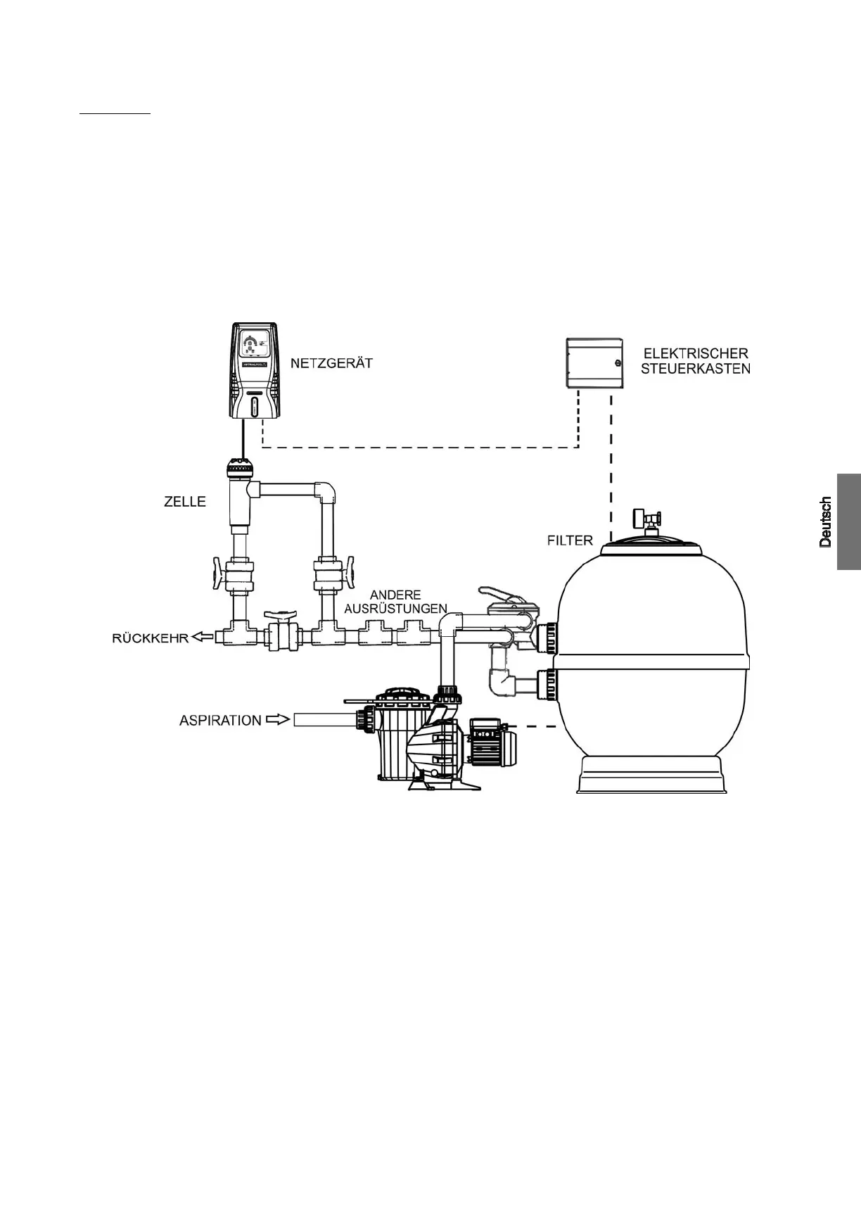 Netzgerätes an das Stromnetz muss im elektrischen Steuerkasten der Filteranlage (z.B. Filtersteuerung) erfolgen, so dass die Pumpe und