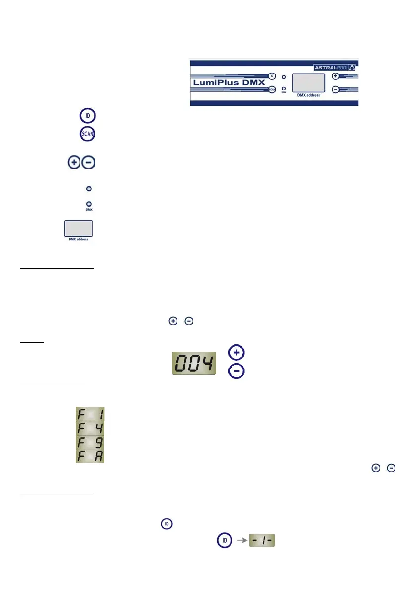 Para seleccionar o endereço DMX utilizam-se os botões e que estão ao lado do monitor. Depois de seleccionado o endereço desejado,