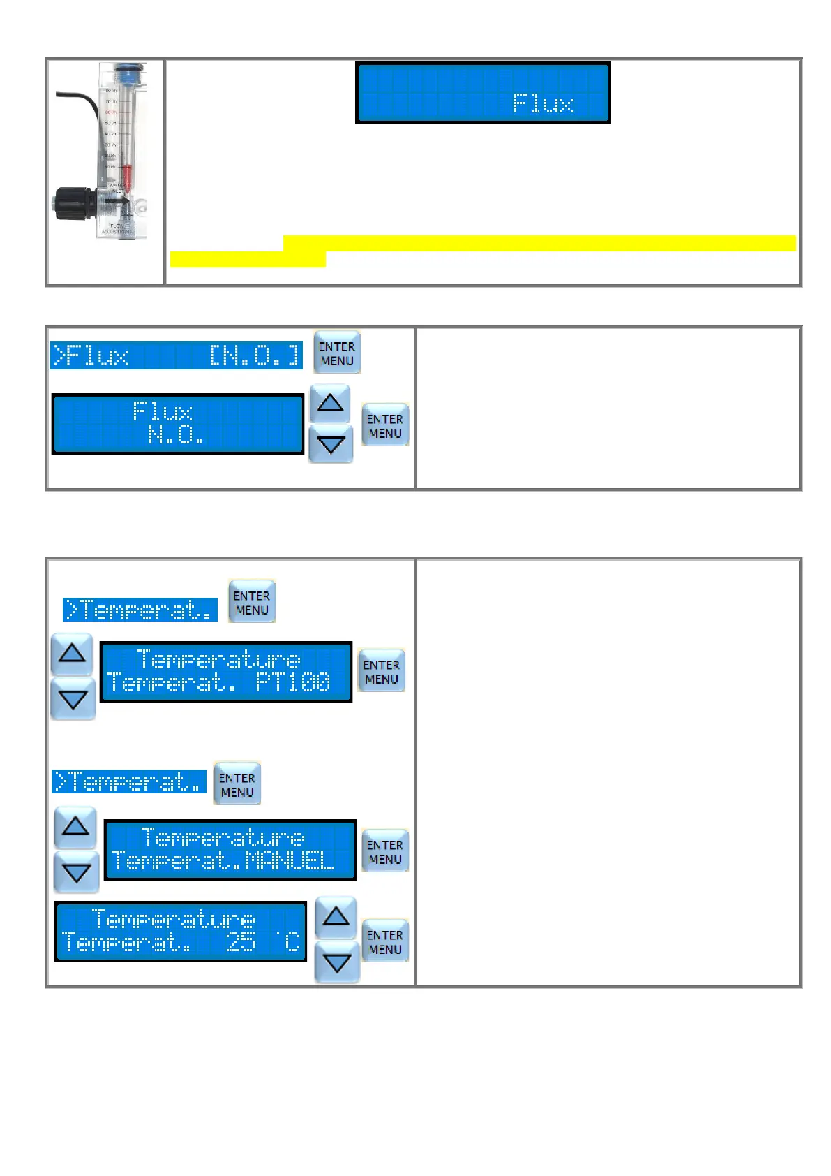 3. L'écran affiche alternativement le message "Flux" sur la deuxième ligne et le mode de