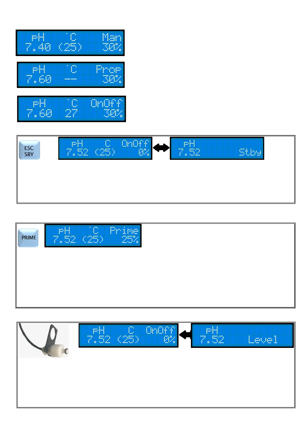 3) the display shows alternativenly “Stby” and the type of dosing (flowrate is 0%)