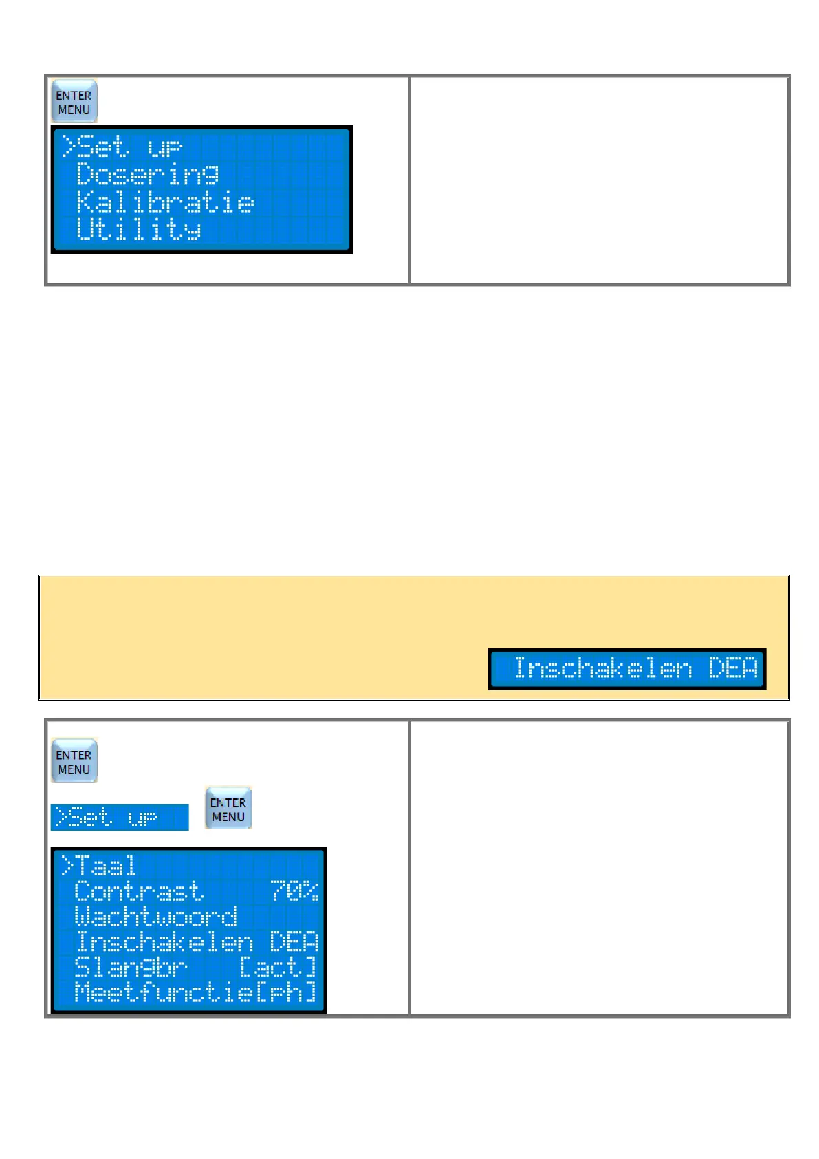 Druk 3 seconden op de ENTER/MENU knop om het menu te