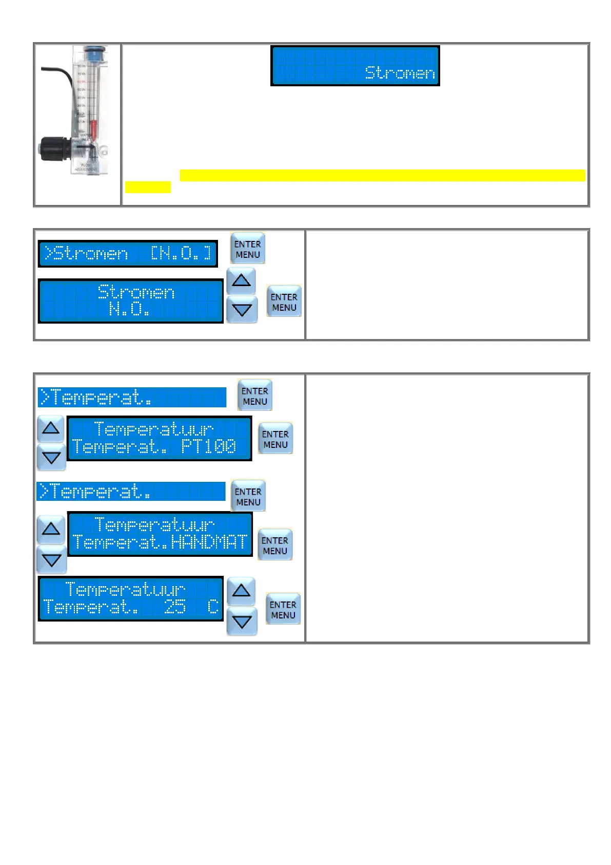 3) Het beeldscherm toont “Stromen” op de tweede regel, afwisselend met de werkmodus en het debiet