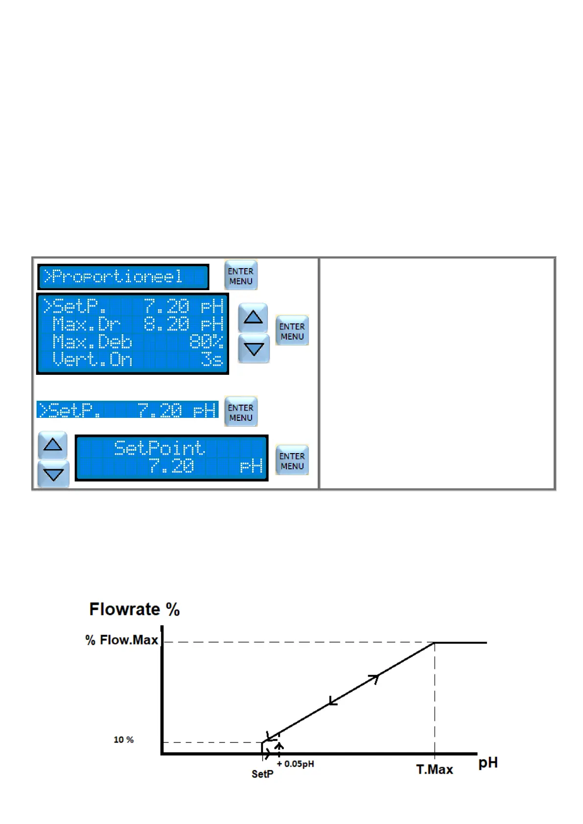 Deze dosering is proportioneel aan de afstand van de pH-meting van het gewenste setpoint. Proportionaliteit wordt