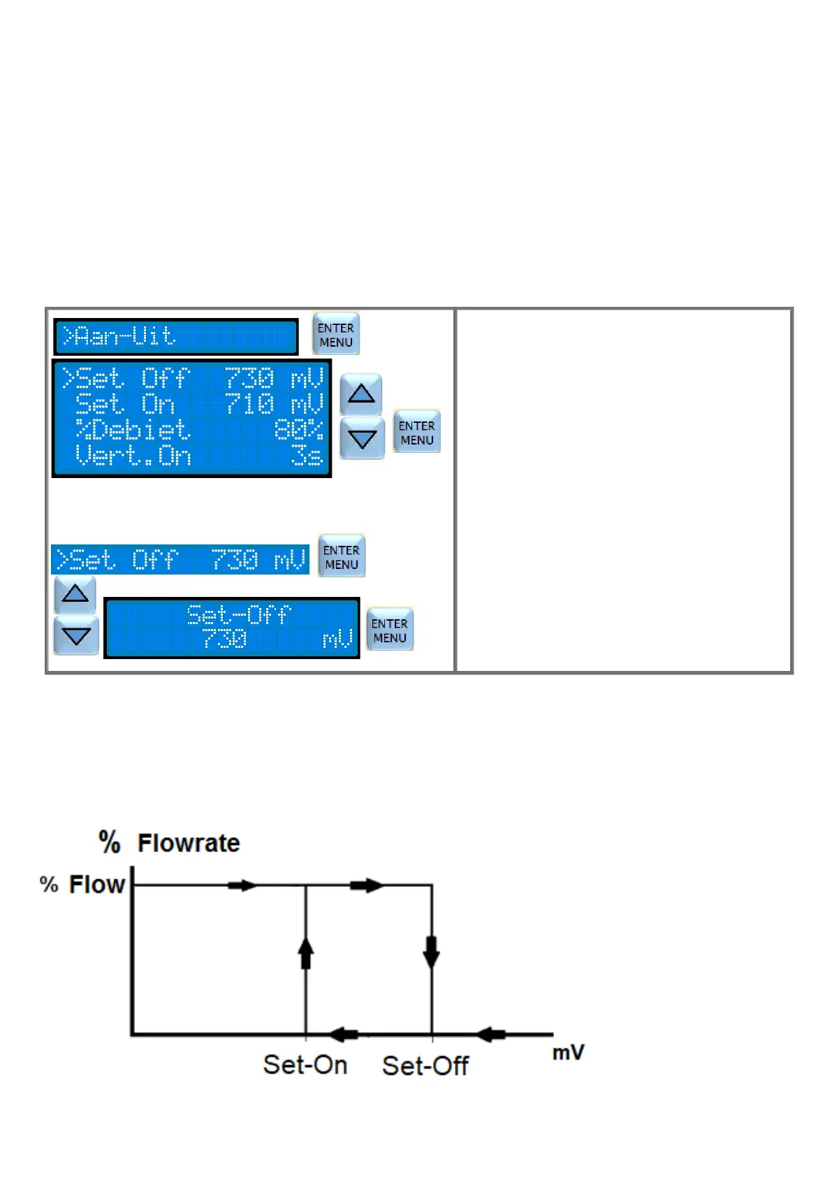 Bij ene meting gelijk aan of lager dan 710mV zal de pomp doseren op 80% van de maximale capaciteit.