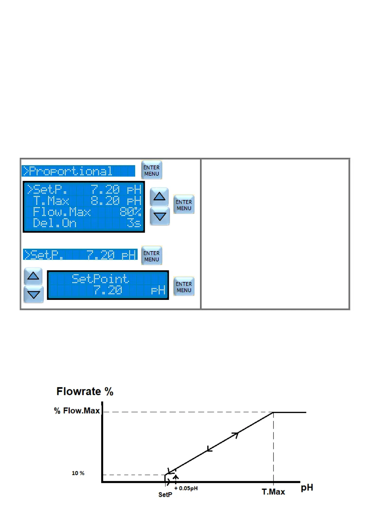 Bei einem Messwert von 8,20 pH oder mehr dosiert die Pumpe bei 80% des maximalen Durchflusses.