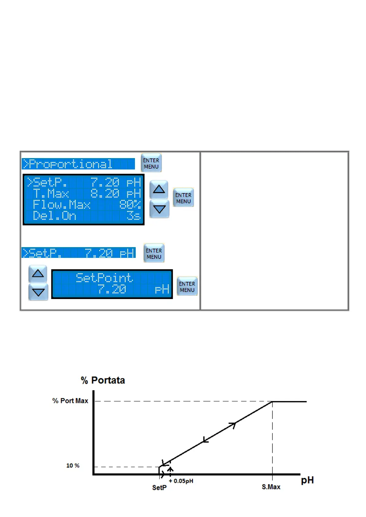 Con misura compresa tra 7.20pH e 8.20pH la pompa dosa proporzionalmente alla distanza della misura dal setpoint.