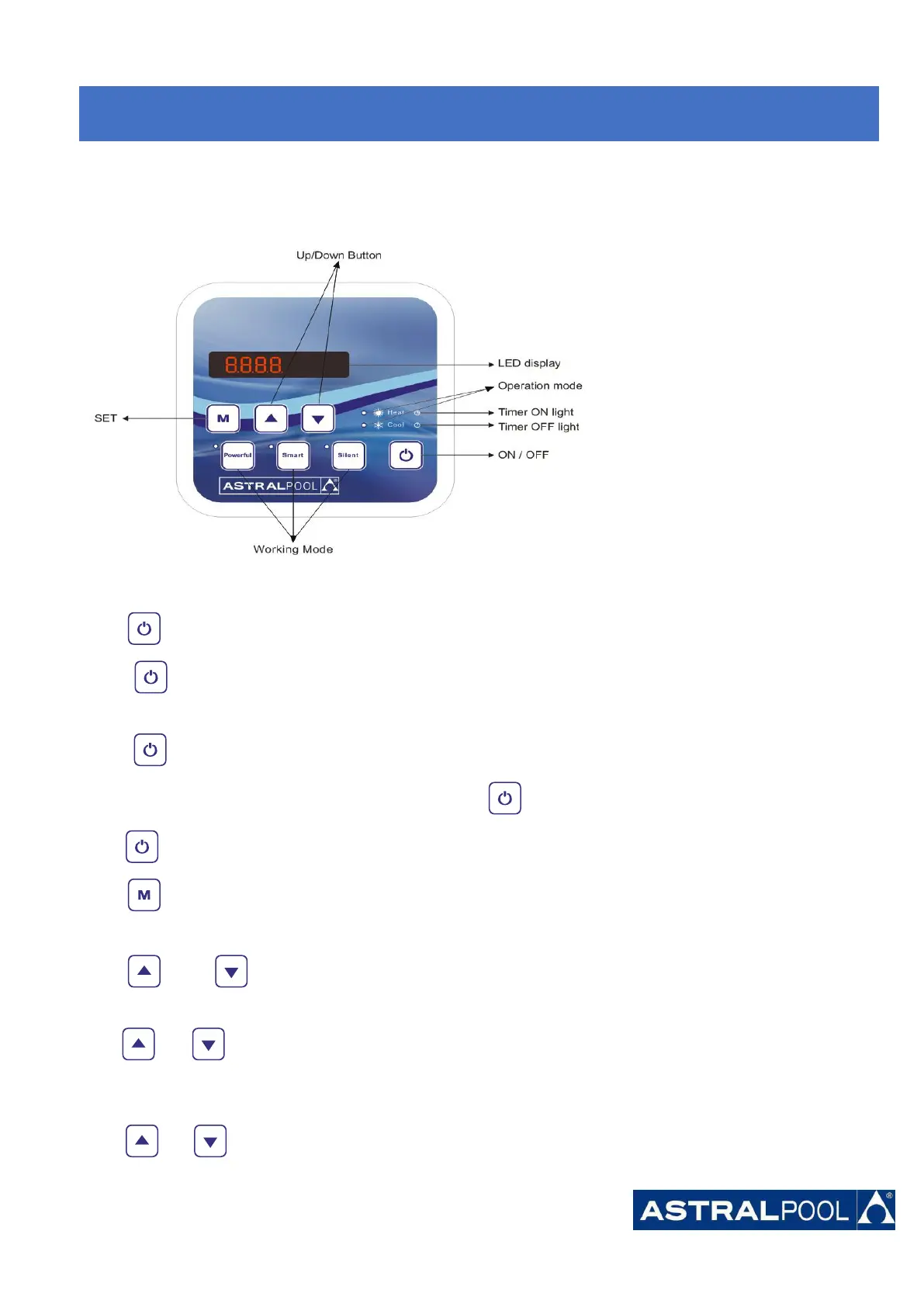 Press to start the heat pump unit, the LED display shows the desired water temperature for 5 seconds, then