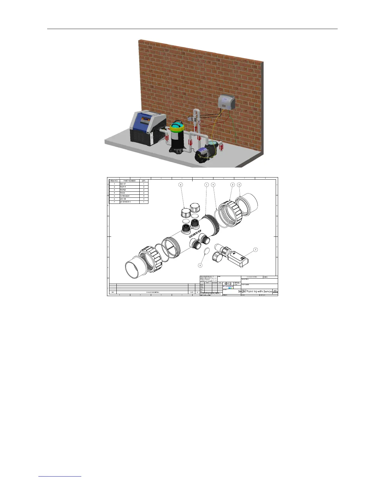 1. Begin installation by plumbing the mixing chamber into the return line of the swimming pool. The mixing chamber