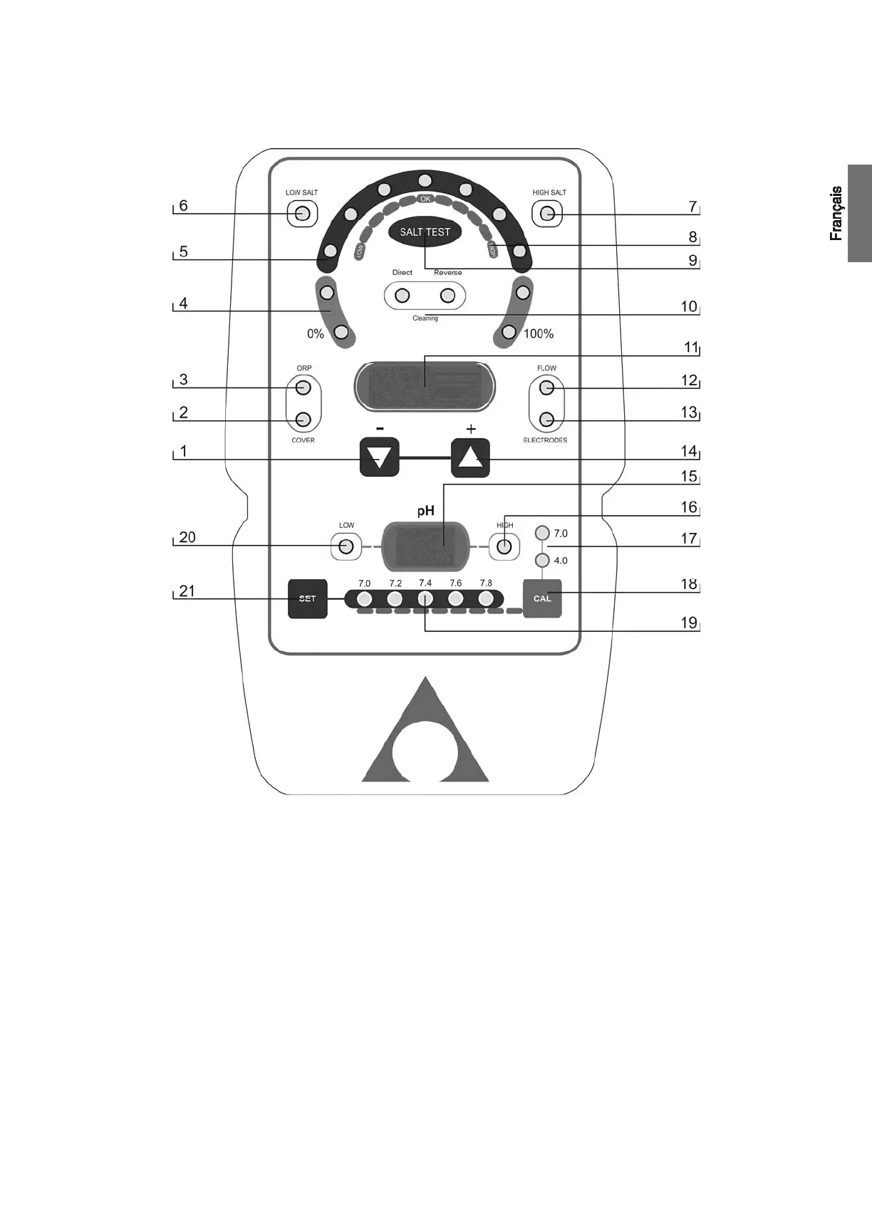 20. Indicateur de ALARME de PH FAIBLE (< 6.5).