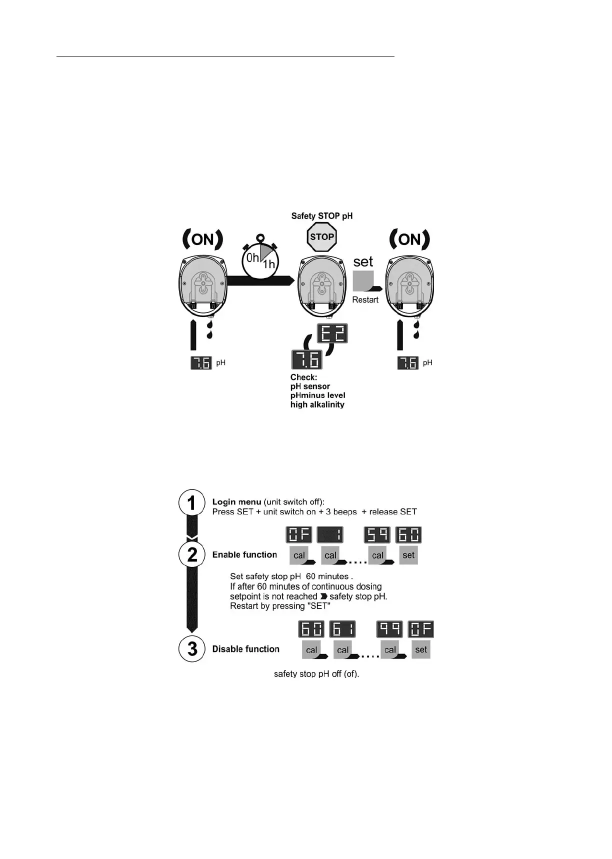 The integrated pH controller has a security system (PUMP-STOP FUNCTION) acting on the dosage pump which allows to avoid the following